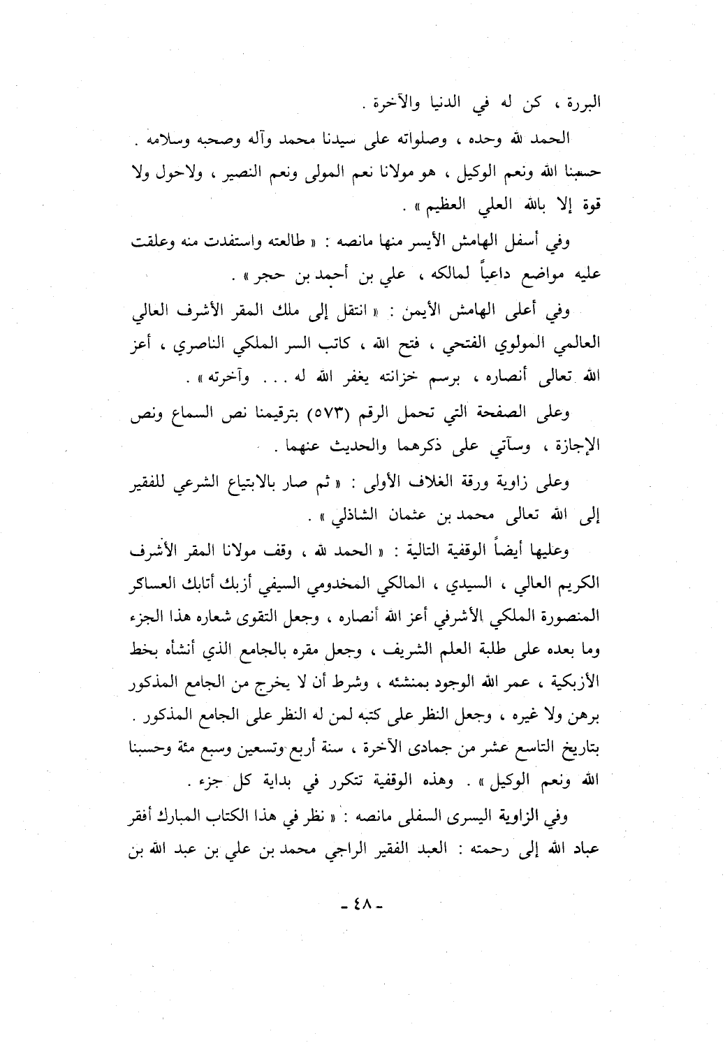 وفي أعلى الهامش الأيمن: "انتقل إلى ملك المقر الأشرف العالي العالمي المولوي الفتحي، فتح الله، كاتب السر الملكي الناصري، أعز الله تعالى أنصاره، برسم خزانته يغفر الله له ... وآخرته".