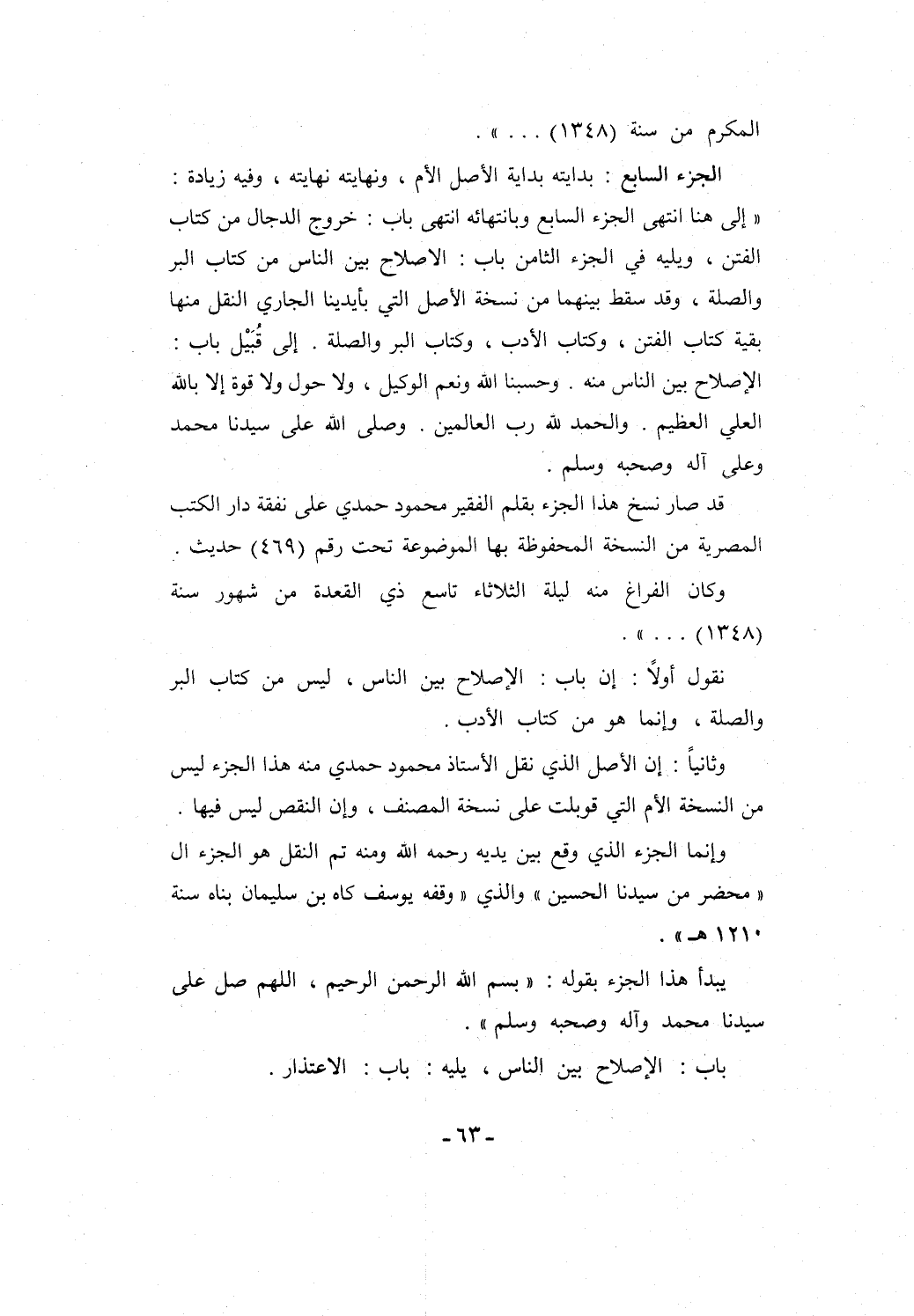 قد صار نسخ هذا الجزء بقلم الفقير محمود حمدي على نفقة دار الكتب المصرية من النسخة المحفوظة بها الموضوعة تحت رقم (469) حديث.