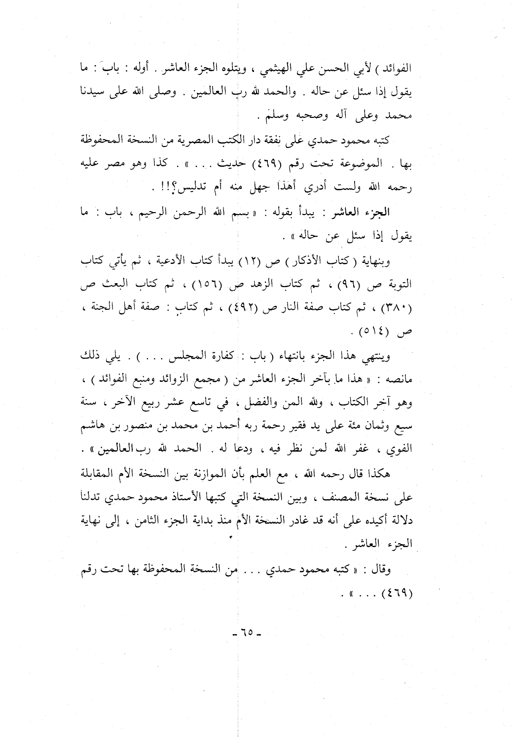 كتبه محمود حمدي على نفقة دار الكتب المصرية من النسخة المحفوظة بها. الموضوعة تحت رقم (469) حديث ... ". كذا وهو مصر عليه رحمه الله ولست أدري أهذا جهل منه أم تدليس؟!!.
