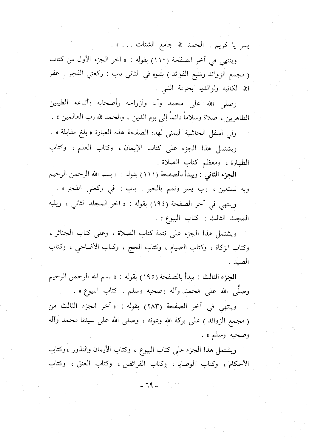 وينتهي في آخر الصفحة (110) بقوله: "آخر الجزء الأول من كتاب (مجمع الزوائد ومنبع الفوائد) يتلوه في الثاني باب: ركعتي الفجر. غفر الله لكاتبه ولوالديه بحرمة النبي.