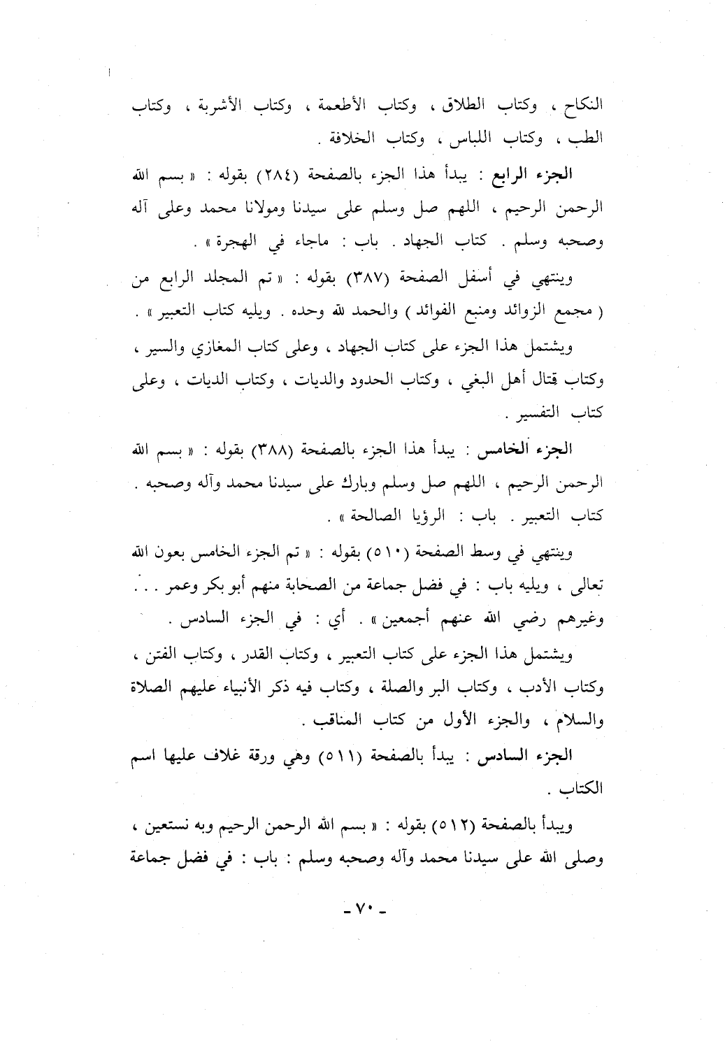 وينتهي في وسط الصفحة (510) بقوله: "تم الجزء الخامس بعون الله تعالى، ويليه باب: في فضل جماعة من الصحابة منهم أبو بكر وعمر ... وغيرهم رضي الله عنهم أجمعين". أي: في الجزء السادس.