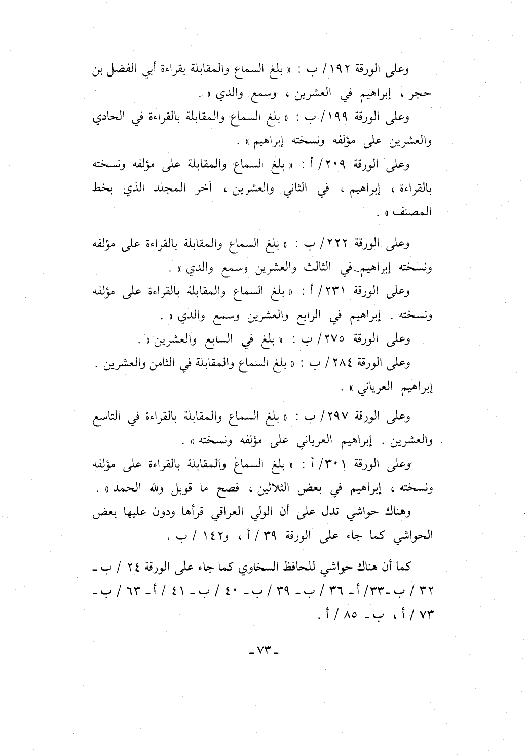 وعلى الورقة 192/ ب: "بلغ السماع والمقابلة بقراءة أبي الفضل بن حجر، إبراهيم في العشرين، وسمع والدي".