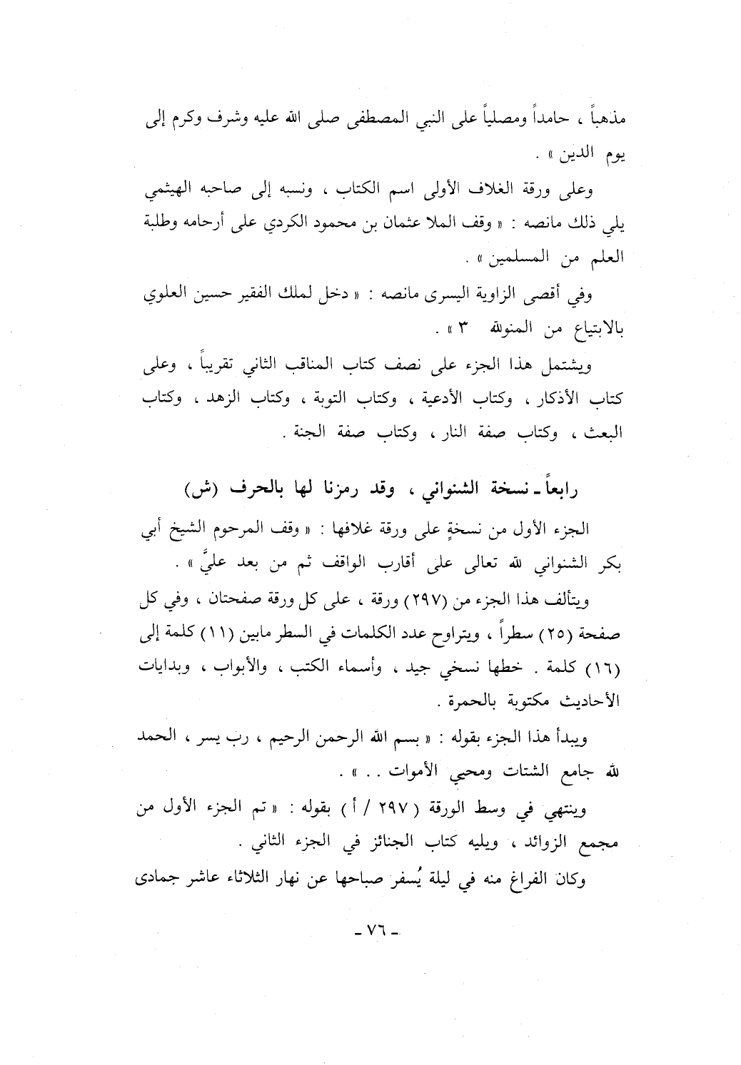 وينتهي في وسط الورقة (297/ أ) بقوله: "تم الجزء الأول من مجمع الزوائد، ويليه كتاب الجنائز في الجزء الثاني.