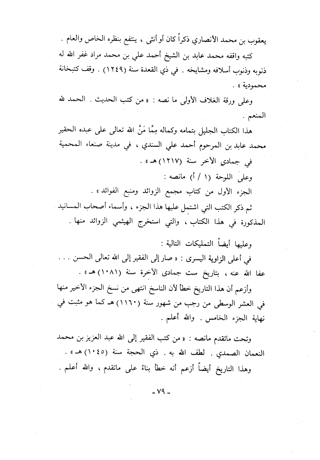 هذا الكتاب الجليل بتمامه وكماله مِمَّا مَنَّ الله تعالى على عبده الحقير محمد عابد بن المرحوم أحمد علي السندي، في مدينة صنعاء المحمية في جمادى الآخر سنة (1217) هـ".