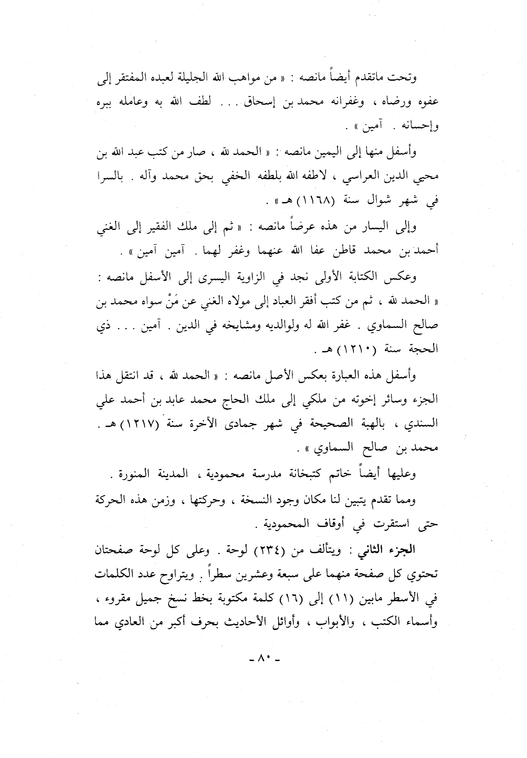 وأسفل هذه العبارة بعكس الأصل ما نصه: "الحمد لله، قد انتقل هذا الجزء وسائر إخوته من ملكي إلى ملك الحاج محمد عابد بن أحمد علي السندي، بالهبة الصحيحة في شهر جمادى الآخرة سنة (1217) هـ. محمد بن صالح السماوي".
