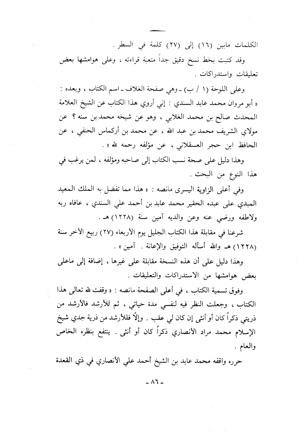 وفي أعلى الزاوية اليسرى ما نصه: "هذا مما تفضل به الملك المعيد المبدي على عبده الحقير محمد عابد بن أحمد علي السندي، عافاه ربه ولاطفه ورضي عنه وعن والديه آمين سنة (1228) هـ.