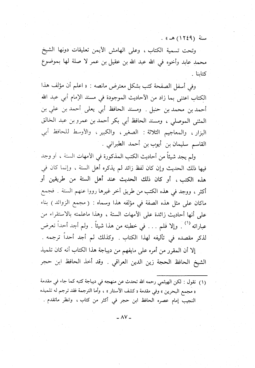 وفي أسفل الصفحة كتب بشكل معترض ما نصه: "اعلم أن مؤلف هذا الكتاب اعتنى بما زاد من الأحاديث الموجودة في مسند الإمام أبي عبد الله أحمد بن محمد بن حنبل. ومسند الحافظ أبي يعلى أحمد بن علي بن المثنى الموصلي، ومسند الحافظ أبي بكر أحمد بن عمرو بن عبد الخالق البزار، والمعاجيم الثلاثة: الصغير، والكبير والأوسط للحافظ أبي القاسم سليمان بن أيوب بن أحمد الطبراني.