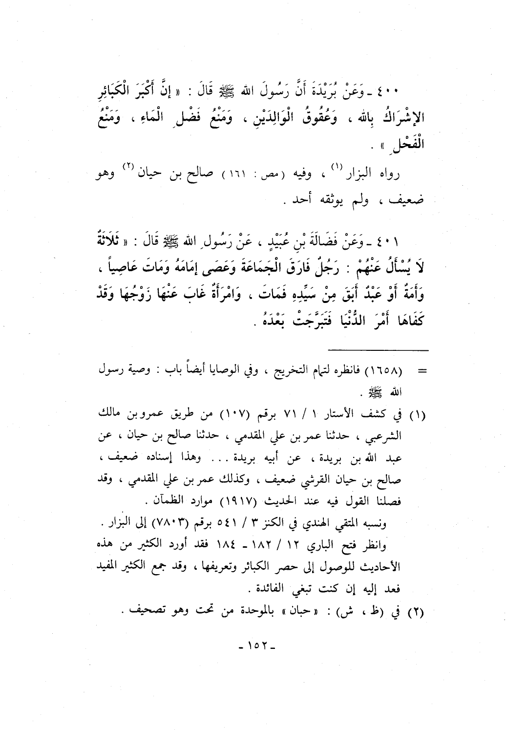 400 - وَعَنْ بُرَيْدَةَ أَنَّ رَسُولَ الله - صلى الله عليه وسلم - قالَ: "إنَّ أَكبَرَ الْكَبَائِرِ الإِشْرَاكُ بِالله، وَعُقُوق الوَالِدَيْنِ، وَمَنْعُ فَضْلِ الْمَاءِ، وَمَنْعُ الْفَحْلَ".