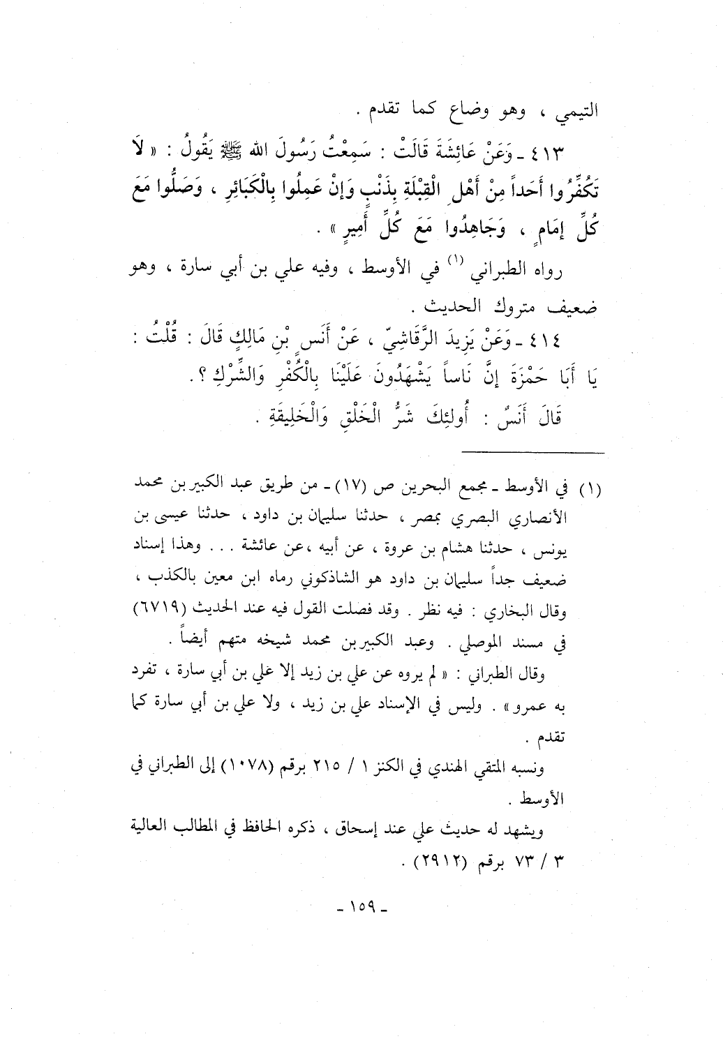 413 - وَعَنْ عَائِشَةَ قَالَتْ: سَمِعْتُ رَسُولَ الله - صلى الله عليه وسلم - يَقُولُ: "لاَ تَكُفِّرُوا أَحَداً مِنْ أَهْلِ الْقِبْلَةِ بِذَنْب وَإنْ عَمِلُوا بِالْكَبَائِرِ، وَصَلُّوا مَعَ كُلِّ إمَامٍ، وَجَاهِدُوا مَعَ كُلِّ أَمِيرٍ".