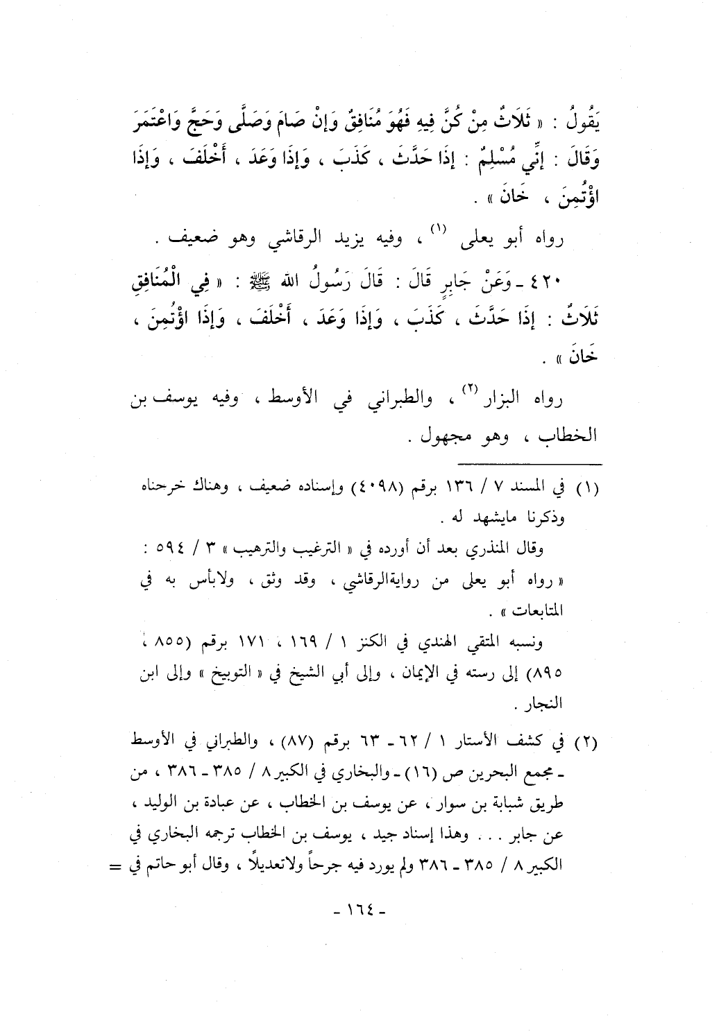 420 - وَعَنْ جَابِرٍ قَالَ: قَالَ رَسُولُ الله - صلى الله عليه وسلم -: "في الْمُنَافِقِ ثَلاَثٌ: إذَا حَدَّثَ، كَذَبَ، وَإذَا وَعَدَ، أَخْلَفَ، وَإذَا اؤْتُمِنَ، خَانَ".