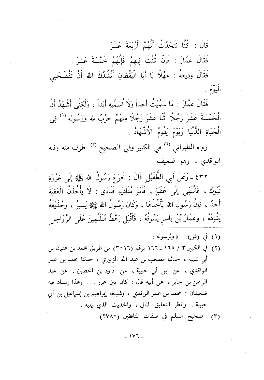 432 - وَعَنْ أَبِي الطُّفَيْلِ قَالَ: خَرَجَ رَسُولُ الله - صلى الله عليه وسلم - إلَى غَزْوَةِ تَبُوكَ، فَانْتَهَى إلَى عَقَبَةٍ، فَأَمَرَ مُنَادِيَهِ فَنَادَى: لاَ يَأْخُذَنَّ الْعَقَبَةَ أَحَدٌ، فَإنَّ رَسُولَ الله يَأْخُذُهَا، وَكَان رَسُولُ الله - صلى الله عليه وسلم - يَسِيرُ، وَحُذَيْفَةُ يَقُودُهُ، وَعَمَّارُ بْنُ يَاسِرٍ يَسُوقُهُ، فَأَقْبَلَ رَهْطٌ مُتَلَثِّمِينَ عَلَى الرَّوَاحِلِ