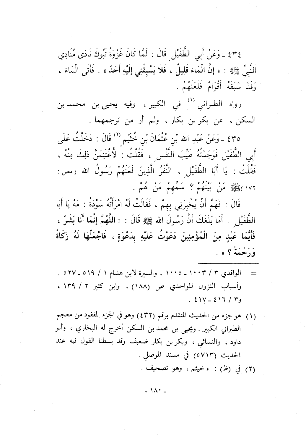 434 - وَعَنْ أَبِي الطفَيْلِ قَالَ: لَمَّا كَانَ غَزْوَةُ تَبُوكَ نَادَىَ مُنَادِي النَّبِيِّ - صلى الله عليه وسلم -: "إِنَّ الْمَاءَ قَلِيلٌ، فَلاَ يَسْبِقْنِي إلَيْهِ أَحَدٌ". فَأَتَى اْلمَاءَ، وَقَدْ سَبَقَهُ أَقْوَامٌ فَلَعَنَهُمْ.