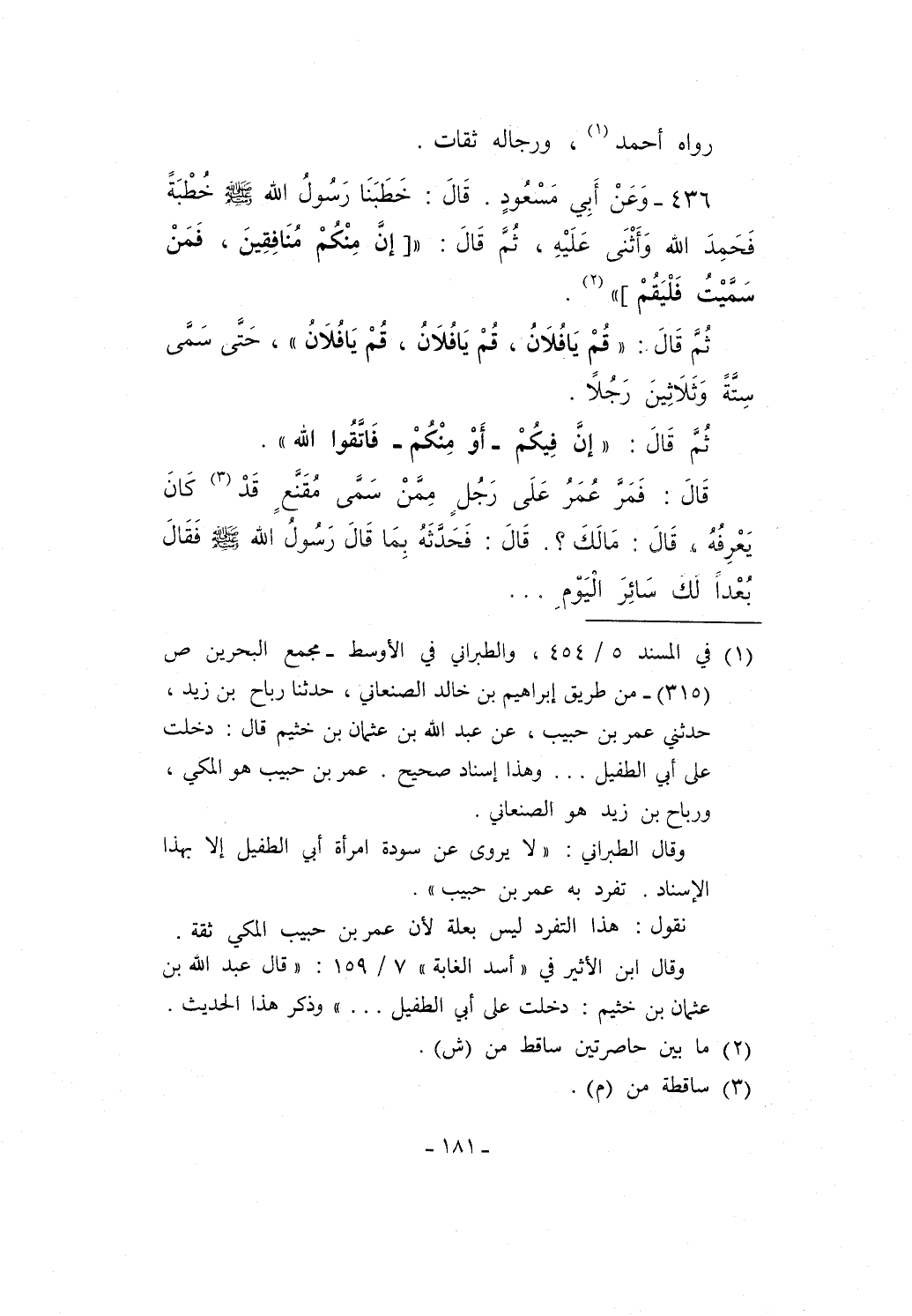 436 - وَعَنْ أَبِي مَسْعُودٍ. قَالَ: خَطَبَنَا رَسُولُ الله - صلى الله عليه وسلم - خُطْبَةً فَحَمِدَ الله وَأَثْنَى عَلَيْهِ، ثُمَّ قَالَ: " [إنَّ مِنْكُمْ مُنَافِقِينَ، فَمَنْ سَمَّيْتُ فَلْيَقُمْ] " (¬2).