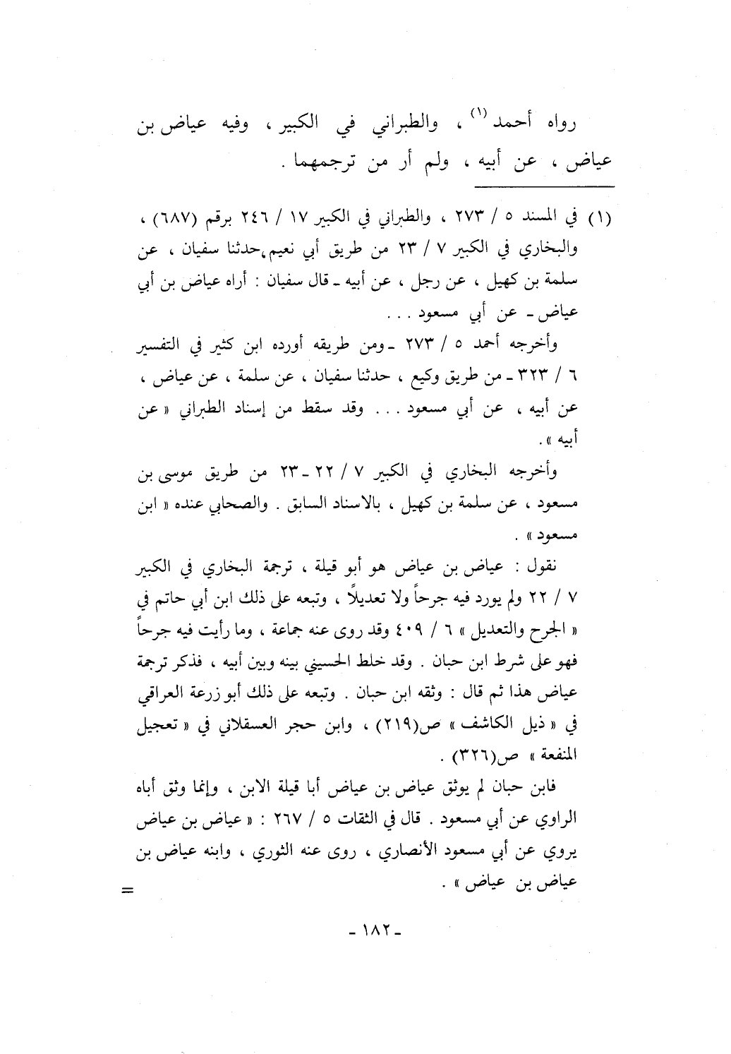(¬1) في المسند 5/ 273، والطبراني في الكبير 17/ 246 برقم (687)، والبخاري في الكبير 7/ 23 من طريق أبي نعيم، حدثنا سفيان، عن سلمة بن كهيل، عن رجل، عن أبيه -قال سفيان: أراه عياض بن أبي عياض- عن أبي مسعود ...