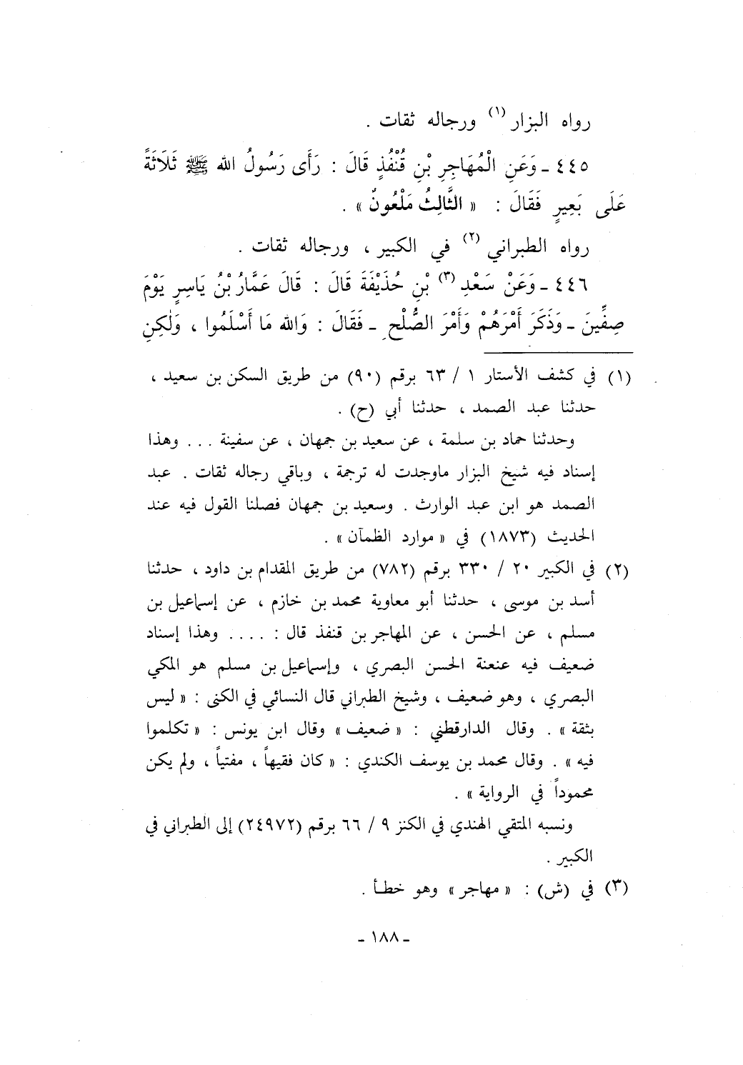 وحدثنا حماد بن سلمة، عن سعيد بن جمهان، عن سفينته ... وهذا إسناد فيه شيخ البزار ما وجدت له ترجمة، وباقي رجاله ثقات. عبد الصمد هو ابن عبد الوارث. وسعيد بن جمهان فصلنا القول فيه عند الحديث (1873) في "موارد الظمآن".