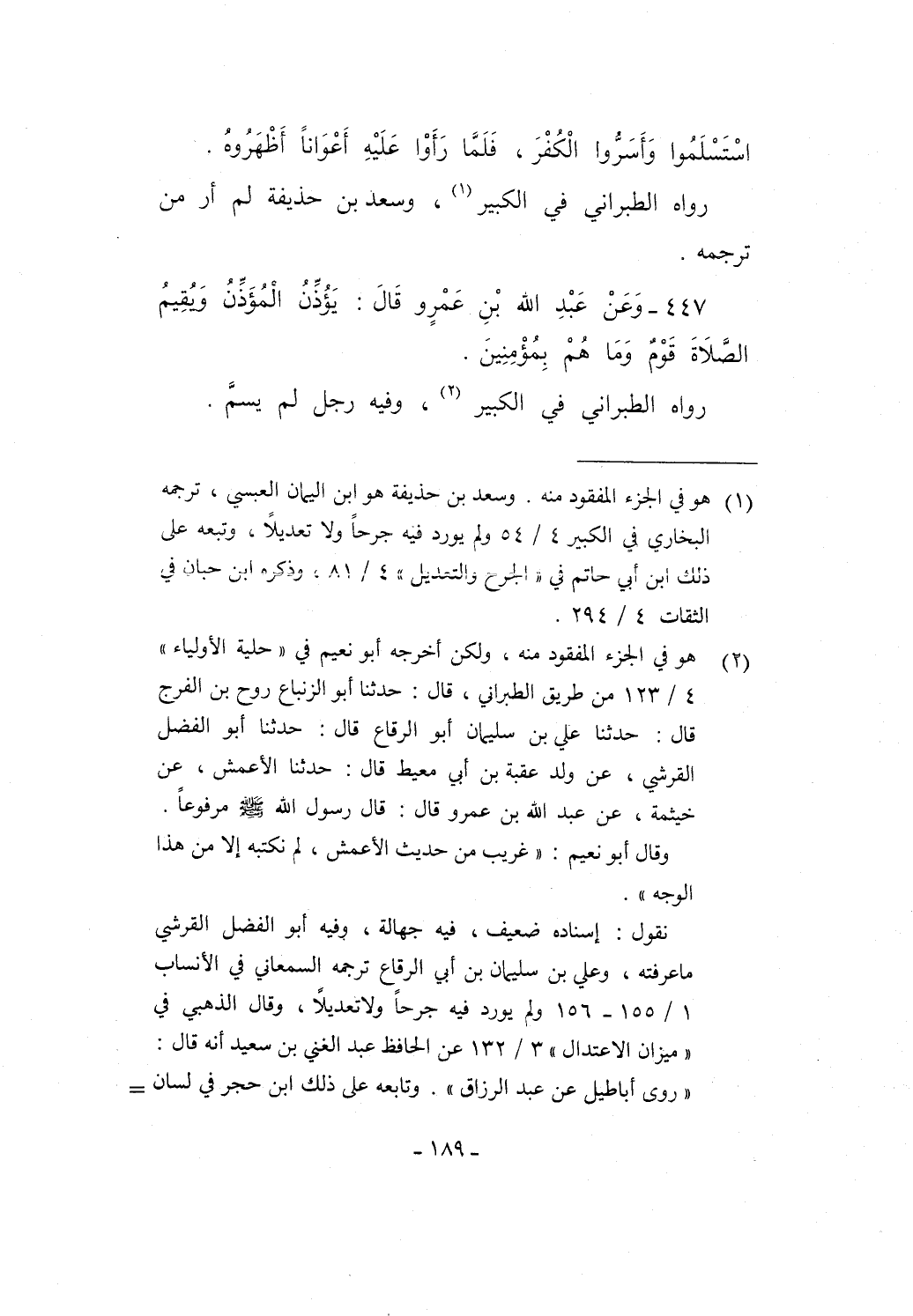 (¬1) هو في الجزء المفقود منه. وسعد بن حذيفة هو ابن اليمان العبسي، ترجمه البخاري في الكبير 4/ 54 لم يورد فيه جرحاً ولا تعديلاً، وتبعه على ذلك ابن أبي حاتم في "الجرح والتعديل" 4/ 81، وذكره ابن حبان في الثقات 4/ 294.