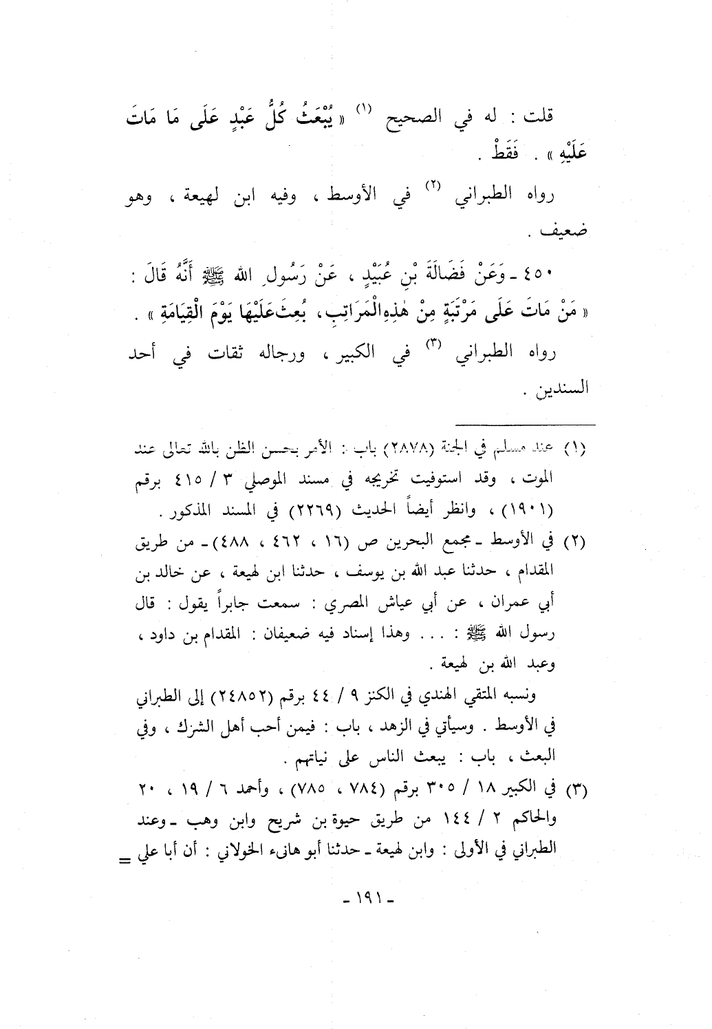 450 - وَعَنْ فَضَالَةَ بْنِ عُبَيْدٍ، عَنْ رَسُولِ الله - صلى الله عليه وسلم - أنَهُ قَالَ: "مَنْ مَاتَ عَلَى مَرْتَبَةٍ مِنْ هذِهِ الْمَرَاتِبِ، بُعِثَ عَلَيْهَا يَوْمَ الْقِيَامَةِ".