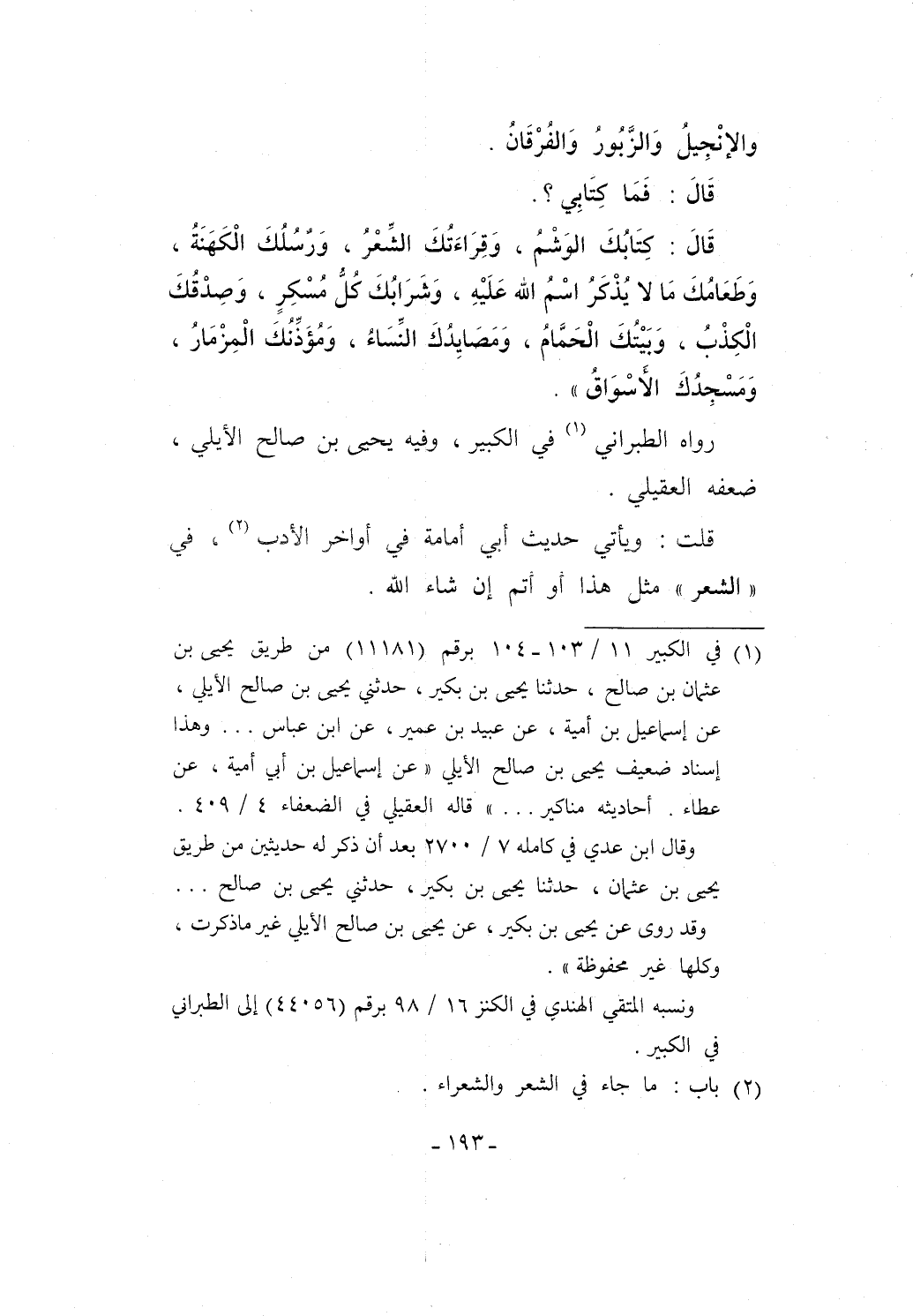 قَالَ: كِتَابُكَ الوَشْمُ، وَقِرَاءَتُكَ الشِّعْرُ، وَرسُلُكَ الْكَهَنَةُ، وَطَعَامُكَ مَا لا يُذْكَرُ اسْمُ الله عَلَيْهِ، وَشَرَابُكَ كُلُّ مُسْكِرٍ، وَصِدْقُكَ الْكِذْبُ، وَبَيْتُكَ الْحَمَّامُ، وَمَصَايِدُكَ النِّسَاءُ، وَمُؤَذِّنُكَ الْمِزْمَارُ، وَمَسْجِدُكَ الَأسْوَاقُ".