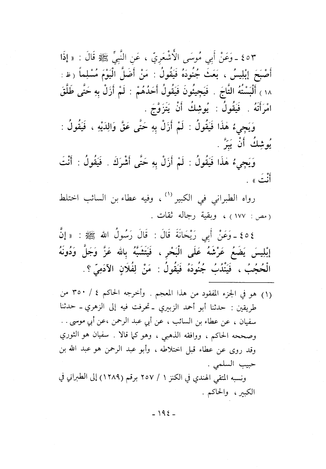454 - وَعَنْ أَبِي رَيْحَانَةَ قَالَ: قَالَ رَسُولُ الله - صلى الله عليه وسلم -: إِنَّ إبْلِيسَ يَضَعُ عَرْشَهُ عَلَى الْبَحْرِ، فَيَتَشَبَّه بِالله عَزَّ وَجَلَّ وَدُونَهُ الْحُجُبُ، فَيَنْدُبُ جُنُودَهُ فَيَقُولُ: مَنْ لِفُلاَنٍ الآدَمِيّ؟.