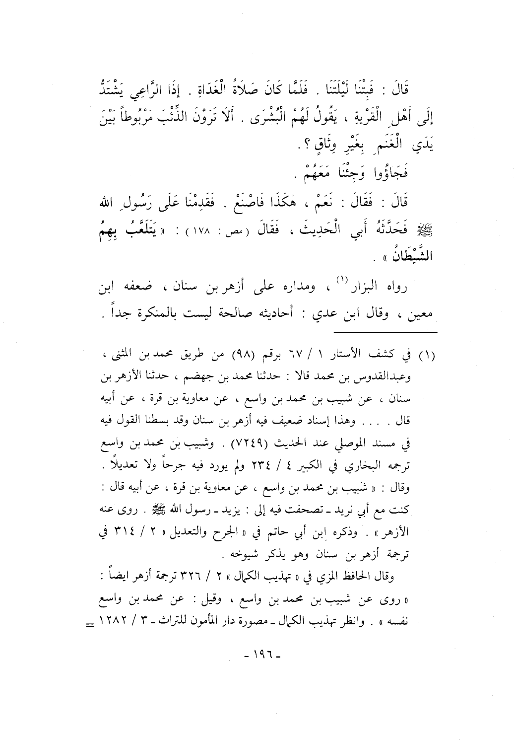 (¬1) في كشف الأستار 1/ 67 برقم (98) من طريق محمد بن المثنى، وعبد القدوس بن محمد قالا: حدثنا محمد بن جهضم، حدثنا الأزهر بن سنان، عن شبيب بن محمد بن واسع، عن معاوية بن قرة، عن أبيه قال .... وهذا إسناد ضعيف في أزهر بن سنان وقد بسطنا القول فيه في مسند الموصلي عند الحديث (7249). وشبيب بن محمد بن واسع ترجمه البخاري في الكبير 4/ 234 ولم يورد فيه جرحاً ولا تعديلاً.