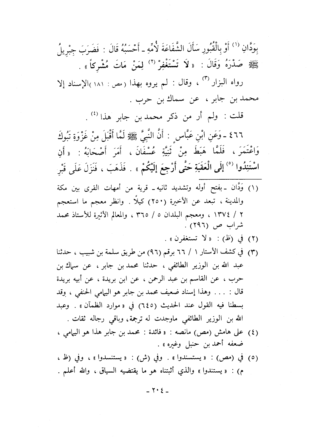 466 - وَعَنِ ابْنِ عَبَّاسٍ: أَنَّ النّبِيَّ - صلى الله عليه وسلم - لَمَّا أَقْبَلَ مِنْ غَزْوَةِ تَبُوكَ وَاعْتَمَرَ، فَلَمَّا هَبَطَ مِنْ ثَنِيَّةِ عُسْفَانَ، أَمَرَ أَصْحَابَهُ: "أَنِ اسْتَنِدُوا (¬5) إلَى الْعَقَبَةِ حَتَّى أَرْجِعَ إلَيْكُمْ". فَذَهَبَ، فَنَزَلَ عَلَى قَبْرِ