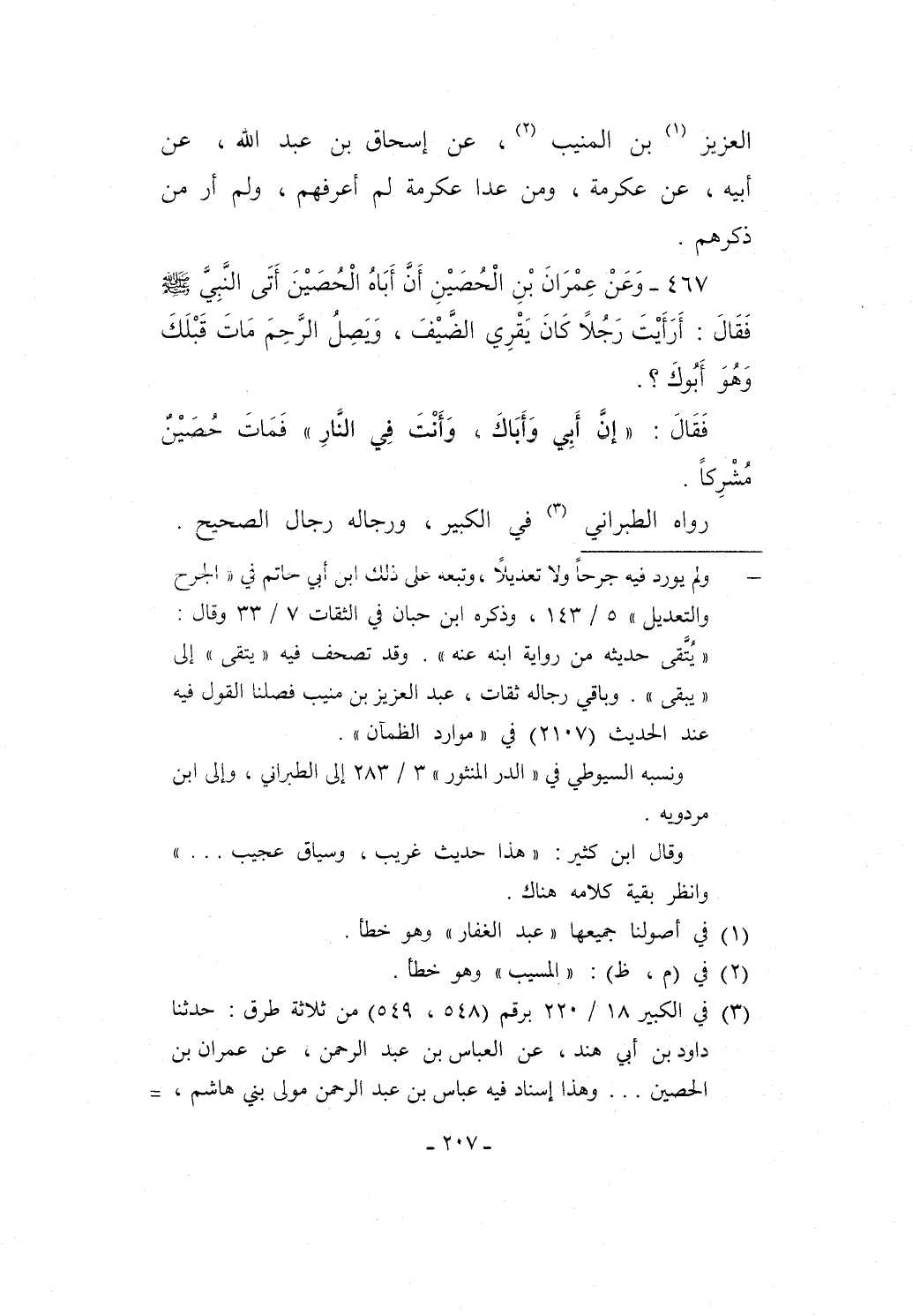 467 - وَعَنْ عِمْرَانَ بْنِ الْحُصَيْنِ أَنَّ أَبَاهُ الْحُصَيْنَ أَتَى النَّبِيَّ - صلى الله عليه وسلم - فَقَالَ: أَرَأَيْتَ رَجُلاً كَانَ يَقْرِي الضَّيْفَ، وَيَصِلُ الرَّحِمَ مَاتَ قَبْلَكَ وَهُوَ أَبُوكَ؟.