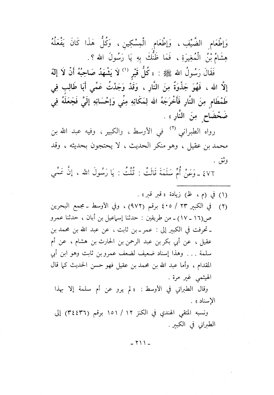 (¬2) في الكبير 23/ 405 برقم (972)، وفي الأوسط -مجمع البحرين ص (16 - 17) - من طريقين: حدثنا إسماعيل بن أبان، حدثنا عمرو -تحرفت في الكبير إلى: عمر- بن ثابت، عن عبد الله بن محمد بن عقيل، عن أبي بكر بن عبد الرحمن بن الحارث بن هشام، عن أم سلمة ... وهذا إسناد ضعيف لضعف عمرو بن ثابت وهو ابن أبي المقدام، وأما عبد الله بن محمد بن عقيل فهو حسن الحديث كما قال الهيثمي غير مرة.