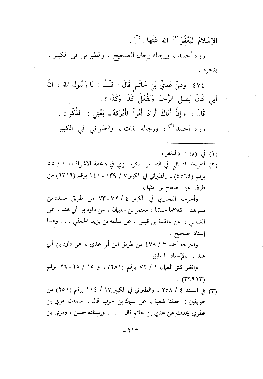 474 - وَعَنْ عَدِيِّ بْنِ حَاتَمٍ قَالَ: قُلْتُ: يَا رَسُولَ الله، إنَّ أَبِي كَانَ يَصِلُ الرَّحِمَ وَيفْعَلُ كَذَا وَكَذَا؟.