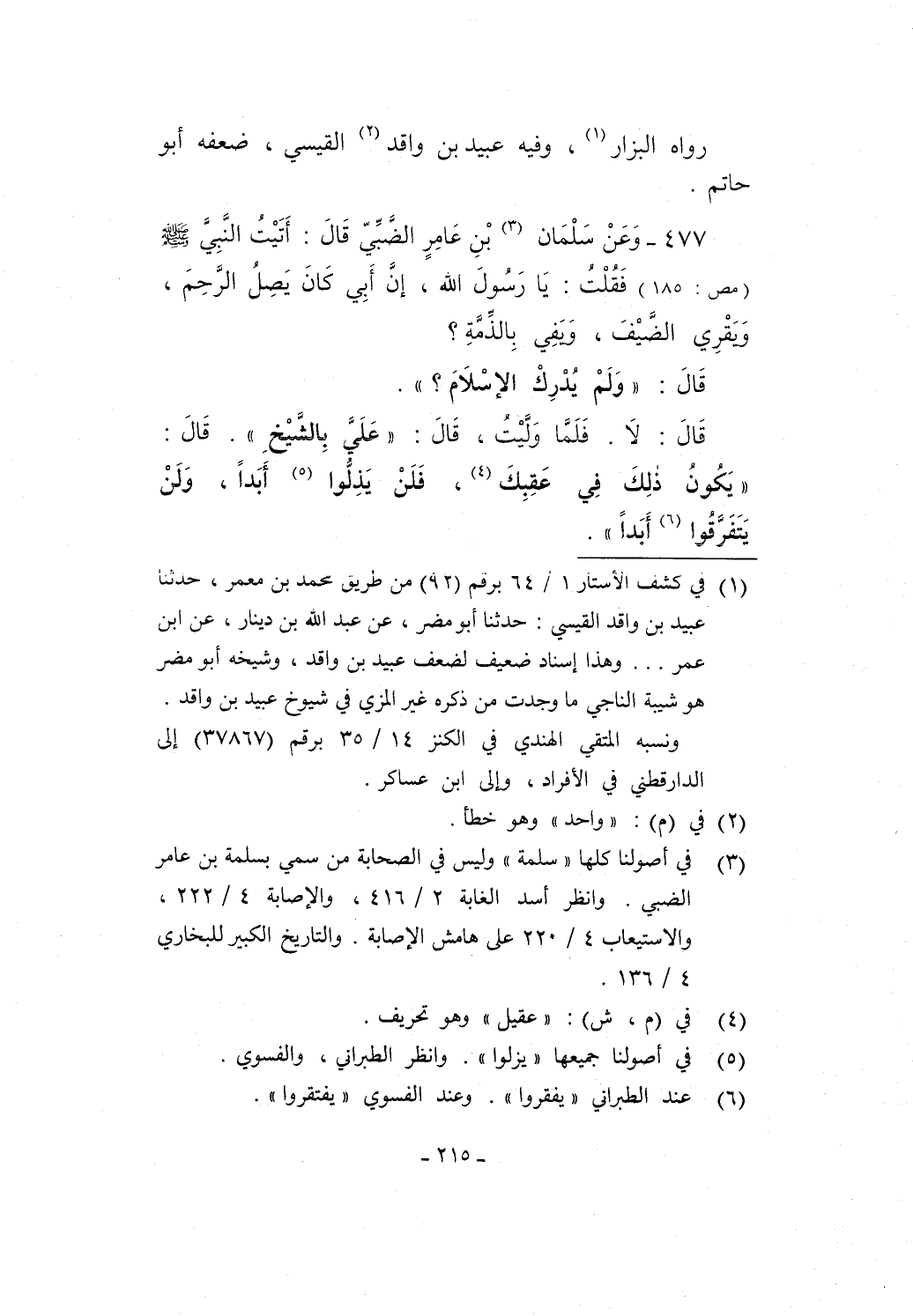 477 - وَعَنْ سَلْمَان (¬3) بْنِ عَامِرٍ الضَّبِّيّ قَالَ: أَتَيْتُ النَّبِيَّ - صلى الله عليه وسلم - (مص: 185) فَقُلْتُ: يَا رَسُولَ الله، إنَّ أَبِي كَانَ يَصِلُ الرَّحِمَ، وَيَقْرِي الضَّيْفَ، وَيَفِي بِالذِّمَّةِ؟