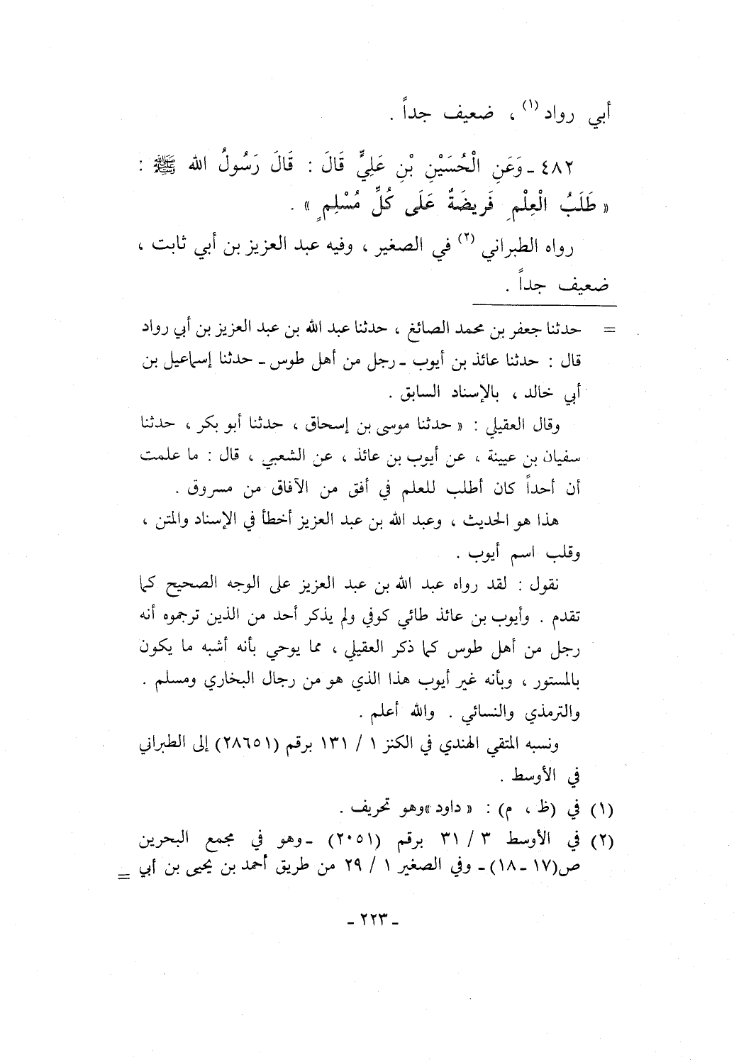 482 - وَعَنِ الْحُسَيْنِ بْنِ عَلِي قَالَ: قَالَ رَسُولُ الله - صلى الله عليه وسلم -: "طَلَبُ الْعِلْمِ فَريضةٌ عَلَى كُلِّ مُسْلِمٍ".