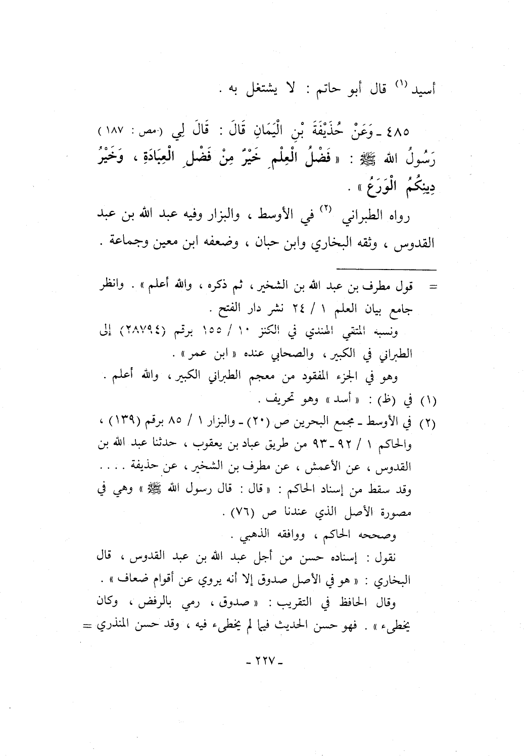 485 - وَعَنْ حُذَيْفَةَ بْنِ الْيَمَانِ قَالَ: قَالَ لِي (مص: 187)