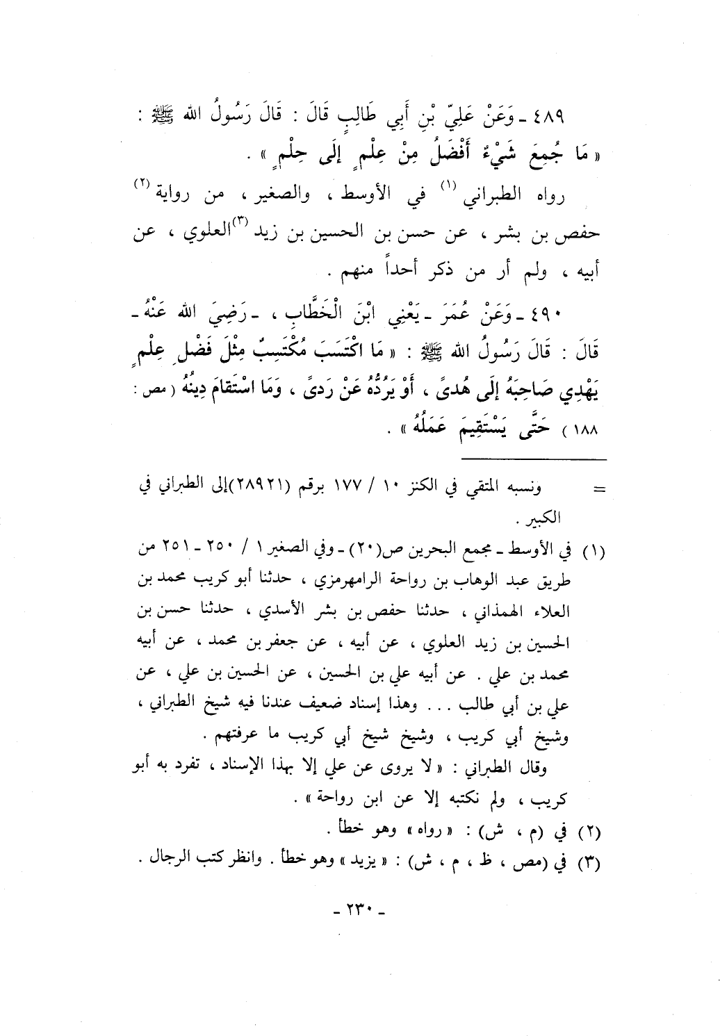 489 - وَعَنْ عَلِيّ بْن أَبِي طَالِبٍ قَالَ: قَالَ رَسُولُ الله - صلى الله عليه وسلم -: "مَا جُمِعُ شَيْءٌ أَفْضَلُ مِنْ عِلْمٍ إلَى حِلْمٍ".