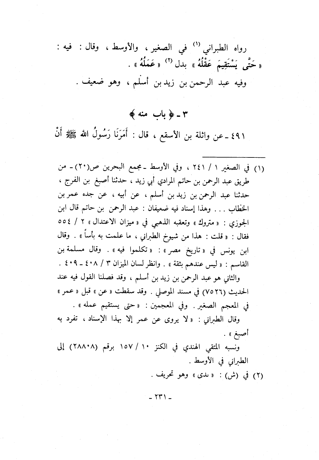 والثاني هو عبد الرحمن بن زيد بن أسلم، وقد فصلنا القول فيه عند الحديث (7526) في مسند الموصلي. وقد سقطت "عن" قبل "عمر" في المعجم الصغير. وفي المعجمين: "حتى يستقيم عمله".