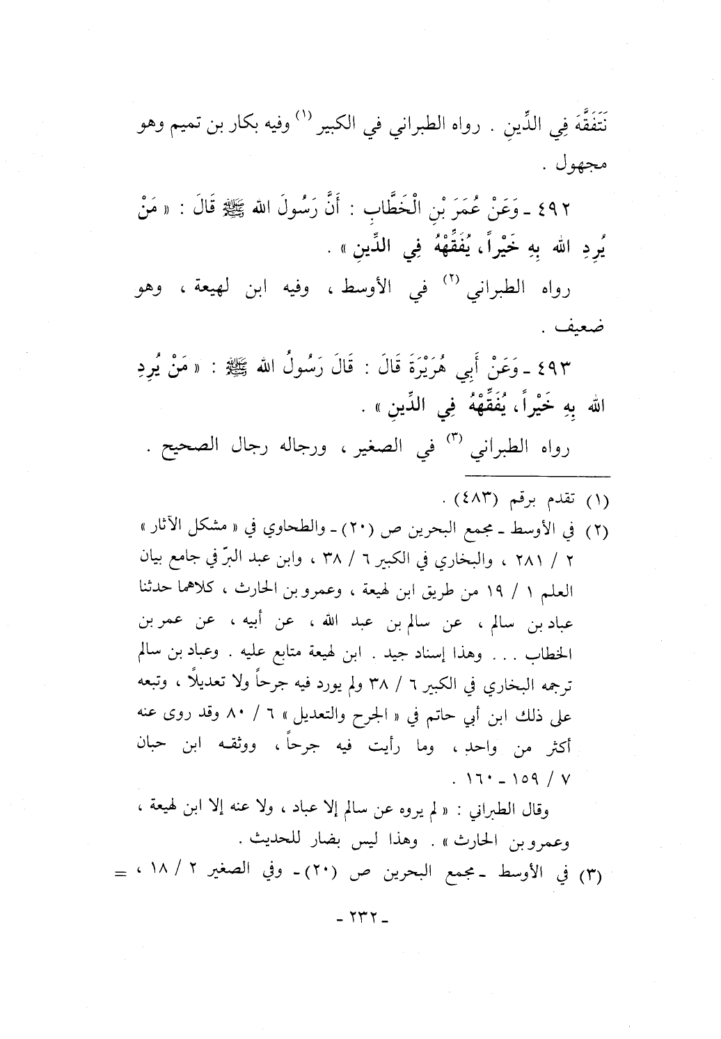 492 - وَعَنْ عُمَرَ بْنِ الْخَطَّابِ: أَنَّ رَسُولَ الله - صلى الله عليه وسلم - قَالَ: "مَنْ يُرِدِ الله بِهِ خَيْراً، يُفَقِّهْهُ في الدِّينِ".
