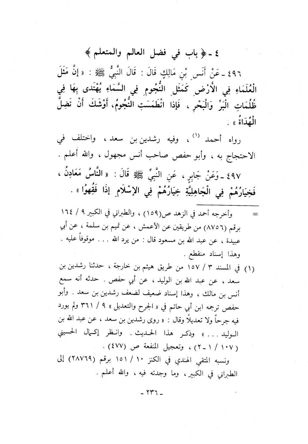 496 - عَنْ أنَسِ بْنِ مَالِك قَالَ: قَالَ النَّبِيُّ - صلى الله عليه وسلم -: "إنَّ مَثَلَ الْعُلَمَاءِ في الأرْضِ كمَثَلِ النُّجُومِ في السَّمَاءِ يُهْتَدىَ بِهَا في ظُلُمَاتِ الْبَر وَالبَحْرِ، فَإذا انْطَمَسَتِ النُّجُومُ، أَوشَكَ أَنْ تَضِلَّ الْهُدَاةُ".