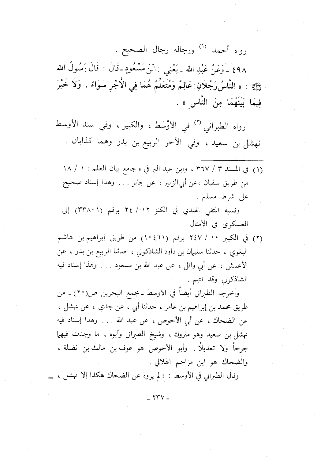 498 - وَعَن عَبْدِ الله -يَعْنِي: ابْن مَسْعُودٍ - قَالَ: قَالَ رَسُولُ الله - صلى الله عليه وسلم -: "النَّاسُ رَجُلاَنِ: عَالِمٌ وَمُتَعَلِّمٌ هُمَا في الأجْرِ سَوَاءٌ، وَلاَ خَيْرَ فِيمَا بَيْنَهُمَا مِنَ النَّاسِ".