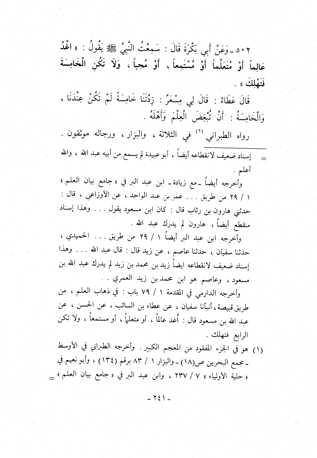 502 - وَعَنْ أَبِي بَكْرَةَ قَالَ: سَمِعْتُ النَّبِيَّ - صلى الله عليه وسلم - يَقُولُ: "اغْدُ عَالِماً أَوْ مُتَعَلِّماً أَوْ مُسْتَمِعاً، أَوْ مُحِباً، وَلاَ تَكُنِ الْخَامِسَةَ فَتَهْلِكَ".