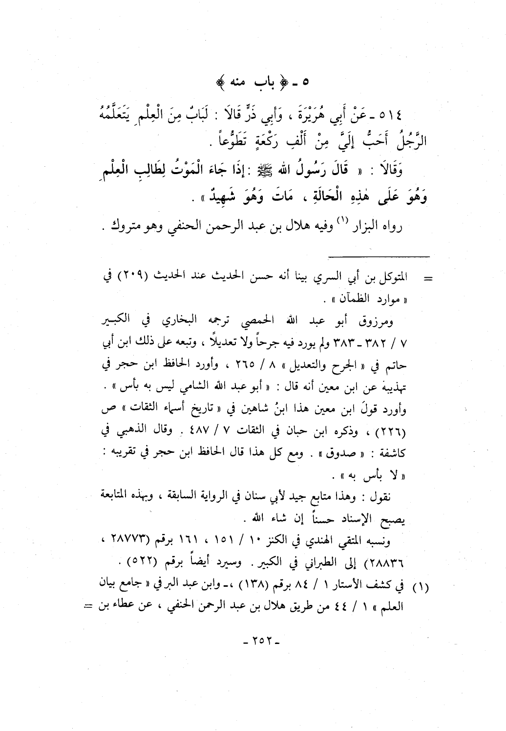 (¬1) في كشف الأستار 1/ 84 برقم (138)، -وابن عبد البر في "جامع بيان العلم" 1/ 44 من طريق هلال بن عبد الرحمن الحنفي، عن عطاء بن =