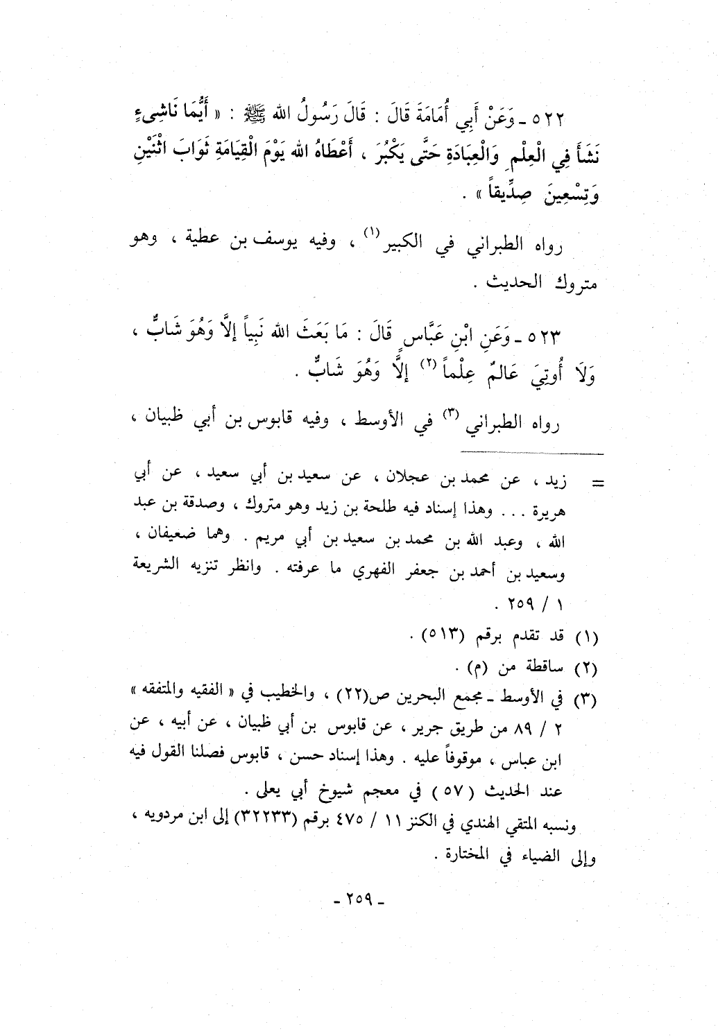 (¬3) في الأوسط - مجمع البحرين ص (22)، والخطيب "الفقيه والمتفقه" 2/ 89 من طريق جرير، عن قابوس بن أبي ظبيان، عن أبيه، عن ابن عباس، موقوفاً عليه. وهذا إسناد حسن، قابوس فصلنا القول فيه عند الحديث (57) في معجم شيوخ أبي يعلى.