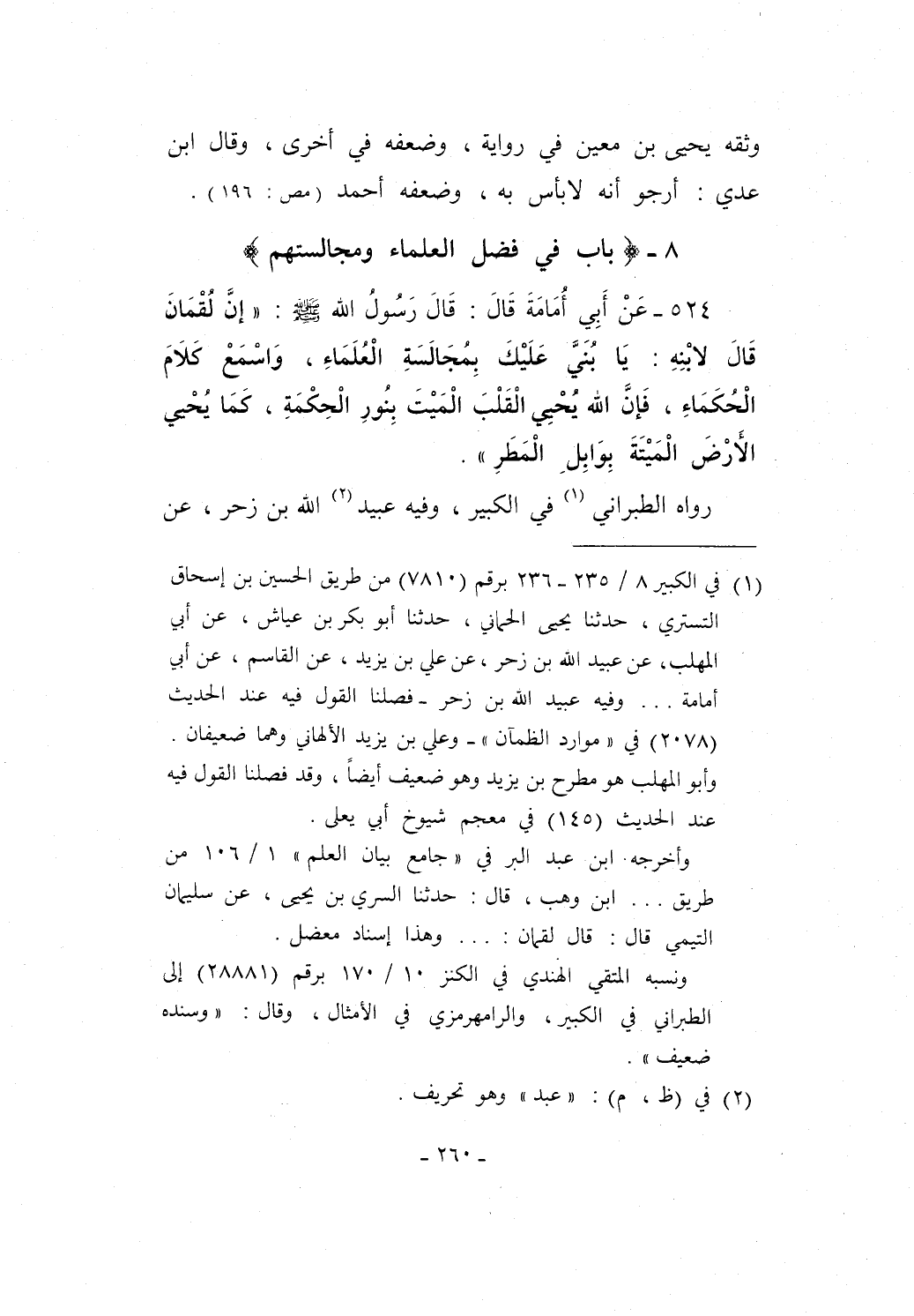 524 - عَنْ أَبِي أُمَامَةَ قَالَ: قَالَ رَسُولُ الله - صلى الله عليه وسلم -: "إنَّ لُقْمَانَ قَالَ لابْنِهِ: يَا بُنَيَّ عَلَيْكَ بِمُجَالَسَةِ الْعُلَمَاءِ، وَاسْمَعْ كَلاَمَ الْحُكَمَاءِ، فَإنَّ الله يُحْيِي الْقَلْبَ الْمَيْتَ بِنُورِ الْحِكْمَةِ، كمَا يُحْيي الَأرْضَ الْمَيْتَةَ بِوَابِلِ الْمَطَرِ".