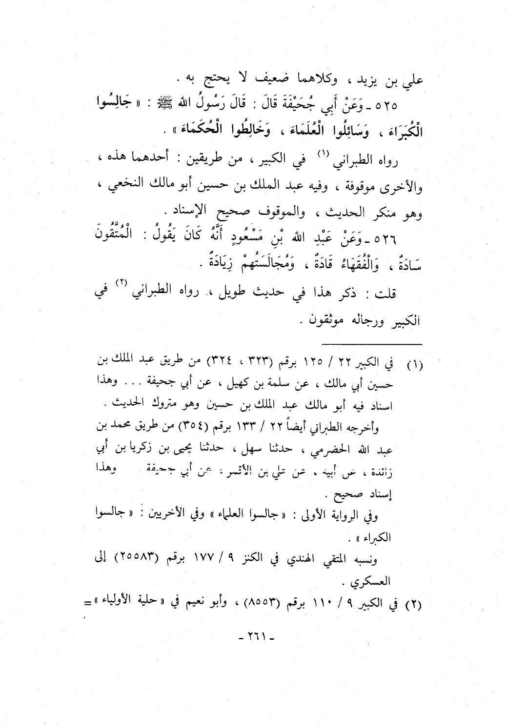 525 - وَعَنْ أَبِي جُحَيْفَةَ قَالَ: قَالَ رَسُولُ الله - صلى الله عليه وسلم -: "جَالِسُوا الْكُبَرَاءَ، وَسَائِلُوا الْعُلَمَاءَ، وَخَالِطُوا الْحُكَمَاءَ".