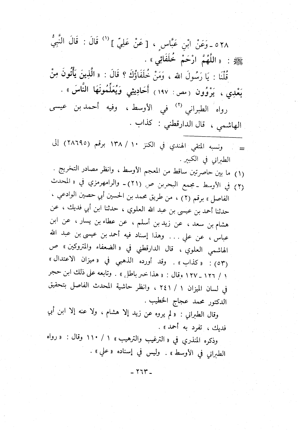 (¬2) في الأوسط -مجمع البحرين ص (21) - والرامهرمزي في "المحدث الفاصل" برقم (2)، من طريق محمد بن الحسين أبي حصين الوادعي، حدثنا أحمد بن عيسى بن عبد الله العلوي، حدثنا ابن أبي فديك، عن هشام بن سعد، عن زيد بن أسلم، عن عطاء بن يسار، عن ابن عباس، عن علي ... وهذا إسناد فيه أحمد بن عيسى بن عبد الله الهاشمي العلوي، قال الدارقطني في "الضعفاء والمتروكين" ص (53): "كذاب". وقد أورده الذهبي في "ميزان الاعتدال" 1/ 126 - 127 وقال: "هذا خبر باطل". وتابعه على ذلك ابن حجر في لسان الميزان 1/ 241، وانظر حاشية المحدث الفاصل بتحقيق الدكتور محمد عجاج الخطيب.