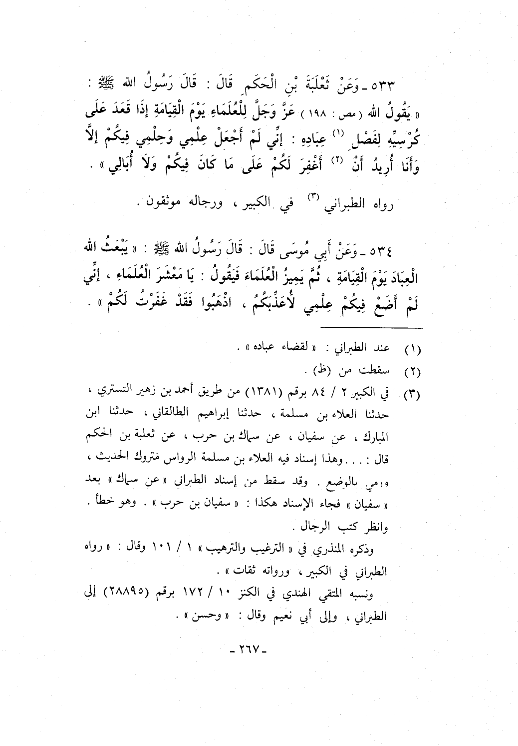 533 - وَعَنْ ثَعْلَبَةَ بْنِ الْحَكَمَ قَالَ: قَالَ رَسُولُ الله - صلى الله عليه وسلم -: "يَقُولُ الله (مص: 198) عَزَّ وَجَلَّ لِلْعُلَمَاءِ يَوْمَ الْقِيَامَةِ إذَا قَعَدَ عَلَى كُرْسِيِّهِ لِفَصْلِ (¬1) عِبَادِهِ: إنِّي لَمْ أَجْعَل عِلْمِي وَحِلْمِي فِيكُمْ إلاَّ وَأَنَا أُرِيدُ أَنْ (¬2) أَغْفِرَ لَكُمْ عَلَى مَا كَانَ فِيكُمْ وَلاَ أُبَالِي".