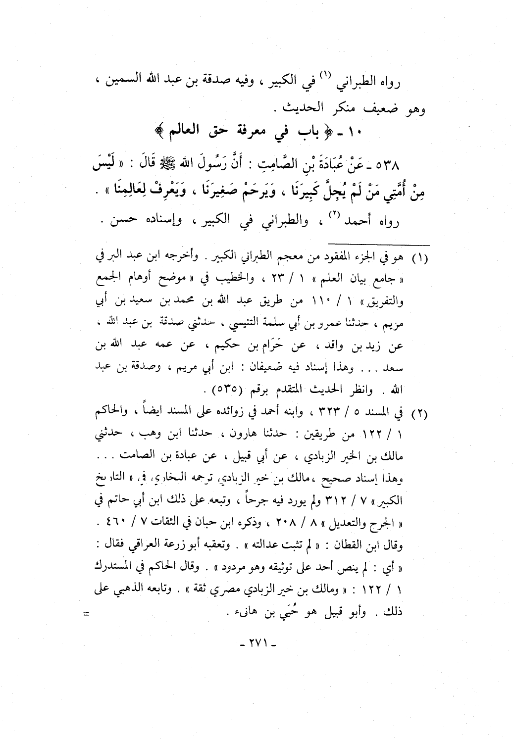 538 - عَنْ عُبَادَةَ بْنِ الصَّامِتِ: أَنَّ رَسُولَ الله - صلى الله عليه وسلم - قَالَ: "لَيْسَ مِنْ أُمَّتِي مَنْ لَمْ يُجِلَّ كَبِيرَنَا، وَيَرحَمْ صَغِيرَنَا، وَيَعْرِفْ لِعَالِمِنَا".