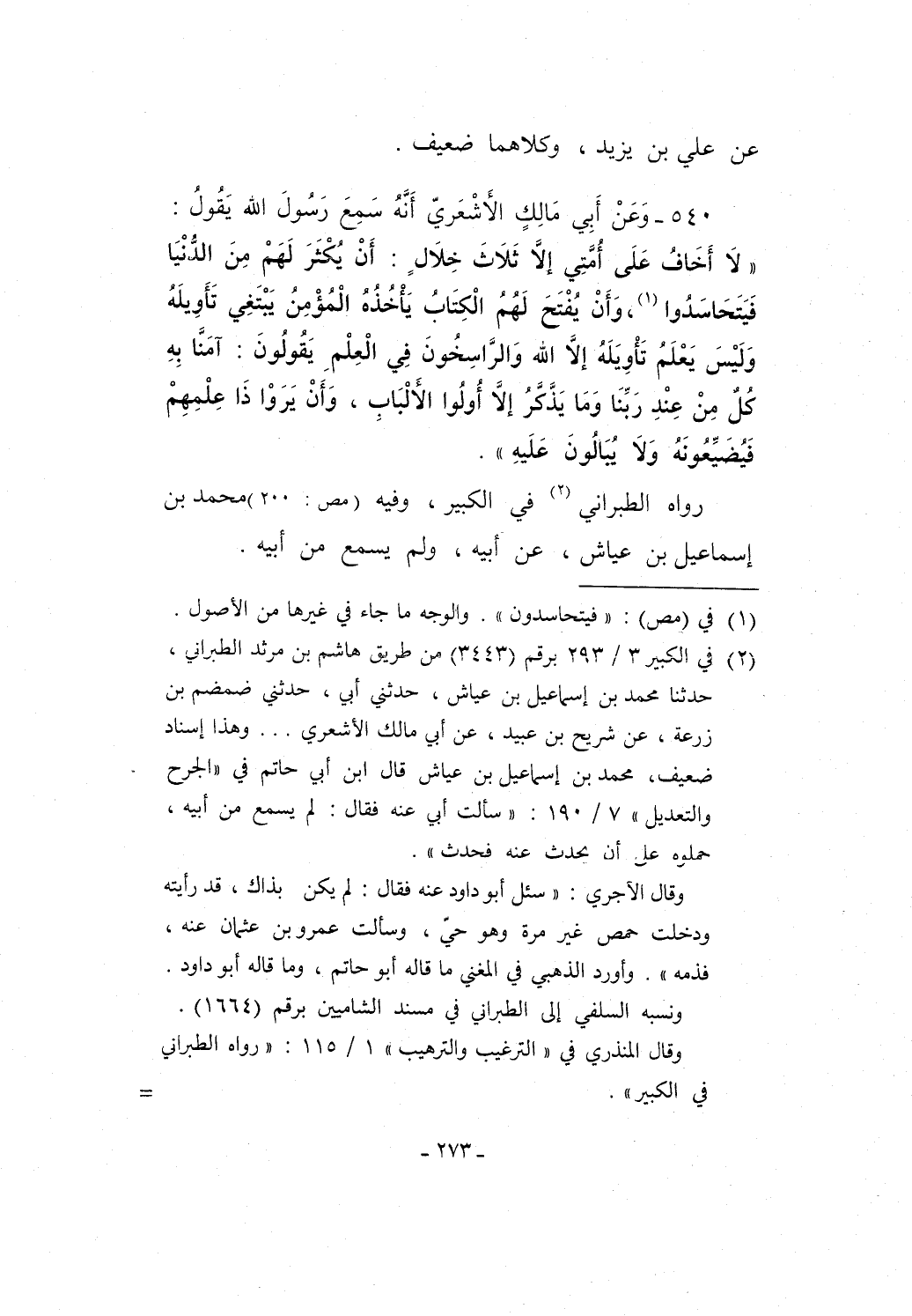 540 - وَعَنْ أَبِي مَالِكٍ الَأشْعَريّ أَنَّهُ سَمِعَ رَسُولَ الله يَقُولُ: "لاَ أَخَافُ عَلَى أُمَّتِي إلاَّ ثَلاَثَ خِلاَلٍ: أَنْ يُكْثَرَ لَهَمْ مِنَ الدُّنْيَا فَيَتَحَاسَدُوا (¬1)، وَأَنْ يُفْتَحَ لَهُمُ الْكِتَابُ يَأْخُذُهُ الْمُؤْمِنُ يَبْتَغِي تَأَوِيلَهُ وَلَيْسَ يَعْلَمُ تَأْوِيَلَهُ إلاَّ الله وَالرَّاسِخُونَ في الْعِلْمِ يَقُولُونَ: آمَنَّا بِهِ كُلٌّ مِنْ عِنْدِ رَبِّنَا وَمَا يَذَّكَّرُ إلاَّ أُولُوا الَألْبَابِ، وَأَنْ يَرَوْا ذَا عِلْمِهِمْ فَيُضَيِّعونَهُ وَلاَ يُبَالُونَ عَلَيهِ".