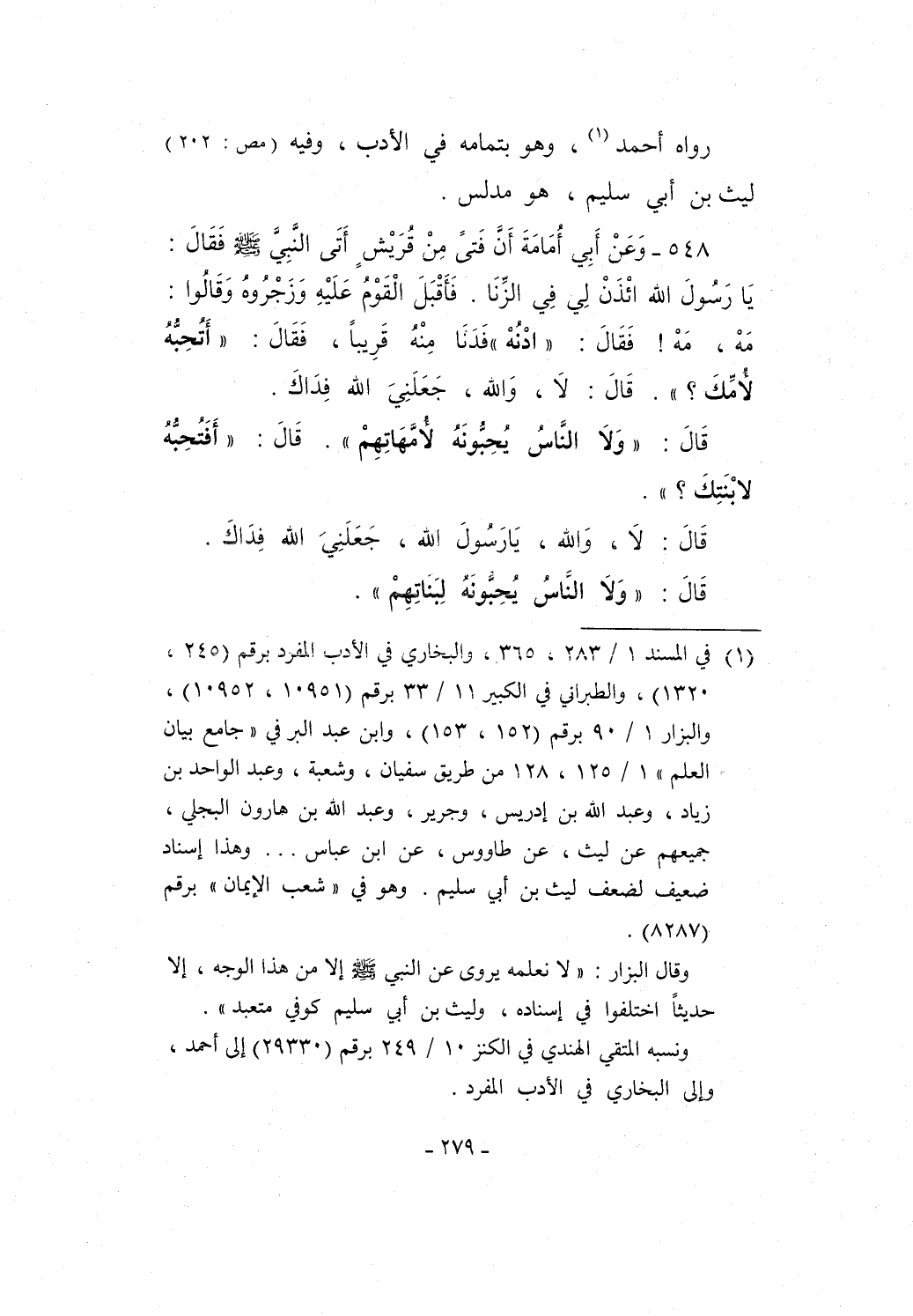 548 - وَعَن أَبِي أُمَامَةَ أَنَّ فَتىً مِنْ قُرَيْشٍ أَتَى النَّبِيَّ - صلى الله عليه وسلم - فَقَالَ: يَا رَسُولَ الله ائْذَنْ لِي في الزِّنَا. فَأَقْبَلَ الْقَوْمُ عَلَيْهِ وَزجْرُوهُ وَقَالُوا: مَهْ، مَهْ! فَقَالَ: "ادْنُهْ" فَدَنَا مِنْهُ قَرِيباً، فَقَالَ: "أَتُحِبُّهُ لأُمِّكَ؟ ". قَالَ: لاَ، وَالله، جَعَلَنِيَ الله فِدَاكَ.