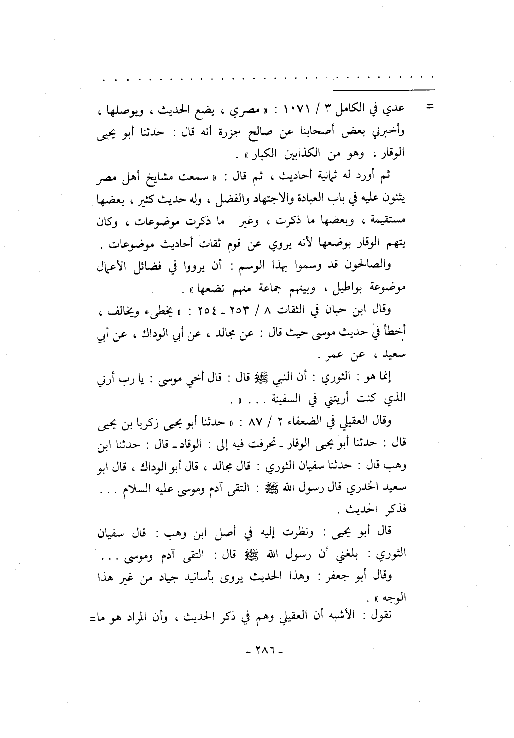 وقال العقيلي في الضعفاء 2/ 87: "حدثنا أبو يحيى زكريا بن يحيى قال: حدثنا أبو يحيى الوقار -تحرفت فيه إلى: الوقاد- قال: حدثنا ابن وهب قال: حدثنا سفيان الثوري: قال مجالد، قال أبو الوداك، قال أبو سعيد الخدري قال رسول الله - صلى الله عليه وسلم -: التقى آدم وموسى عليه السلام ... فذكر الحديث.