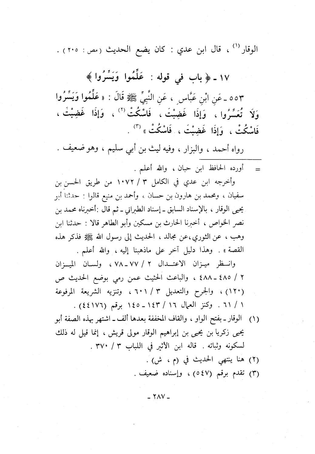 553 - عَنِ ابْنِ عَبَّاسِ، عَنِ النَّبِيِّ - صلى الله عليه وسلم - قَالَ: "عَلِّمُوا وَيَسِّرُوا وَلاَ تُعَسِّرُوا، وَإذَا غَضِبْتَ، فَاسْكُتْ (¬2)، وَإذَا غَضِبْتَ، فَاسْكُتْ، وَإذَا غَضِبْتَ، فَاسْكُتْ" (¬3).