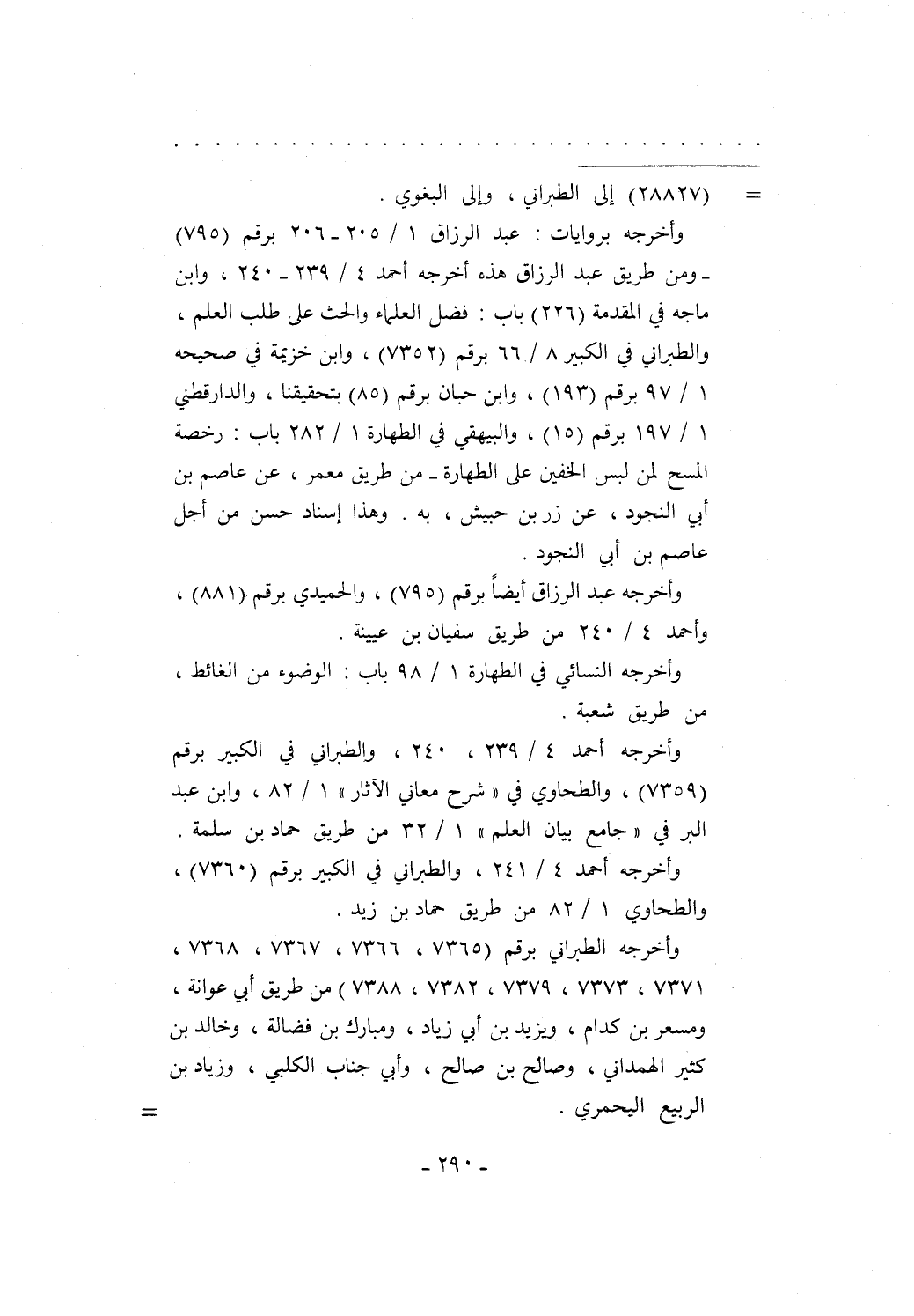 وأخرجه بروايات: عبد الرزاق 1/ 205 - 206 برقم (795) -ومن طريق عبد الرزاق هذه أخرجه أحمد 4/ 239 - 240، وابن ماجه في المقدمة (226) باب: فضل العلماء والحث على طلب العلم، والطبراني في الكبير 8/ 66 برقم (7352)، وابن خزيمة في صحيحه 1/ 97 برقم (193)، وابن حبان برقم (85) بتحقيقنا، والدارقطني 1/ 197 برقم (15)، والبيهقي في الطهارة 1/ 282 باب: رخصة المسح لمن لبس الخفين على الطهارة- من طريق معمر، عن عاصم بن أبي النجود، عن زر بن حبيش، به. وهذا إسناد حسن من أجل عاصم بن أبي النجود.