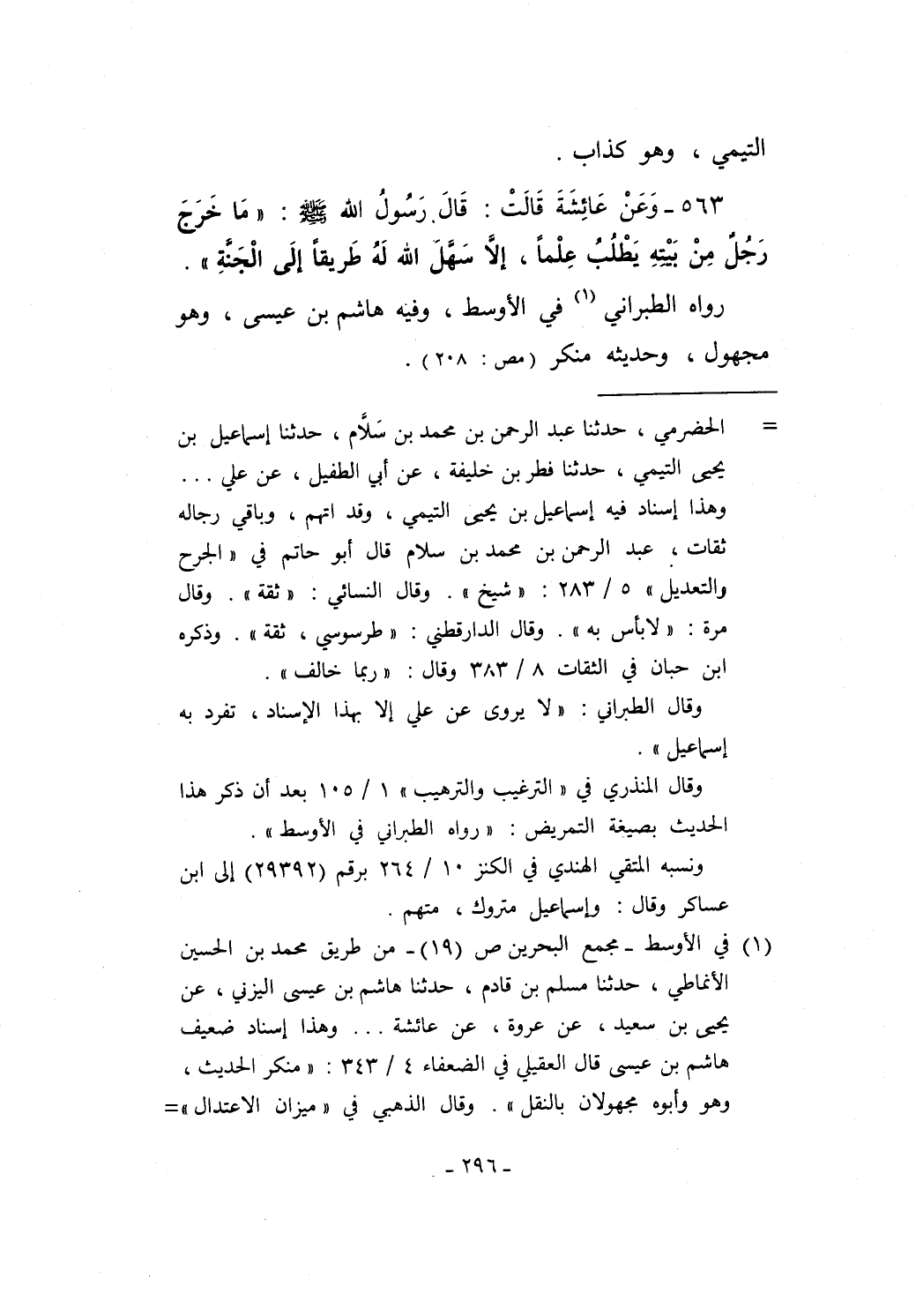 563 - وَعَنْ عَائِشَةَ قَالَتْ: قَالَ رَسُولُ الله - صلى الله عليه وسلم -: "مَا خَرَجَ رَجُلٌ مِنْ بَيْتهِ يَطْلُبُ عِلْماً، إلاَّ سَهَّلَ الله لَهُ طَريقًا إلَى الْجَنَّةِ".